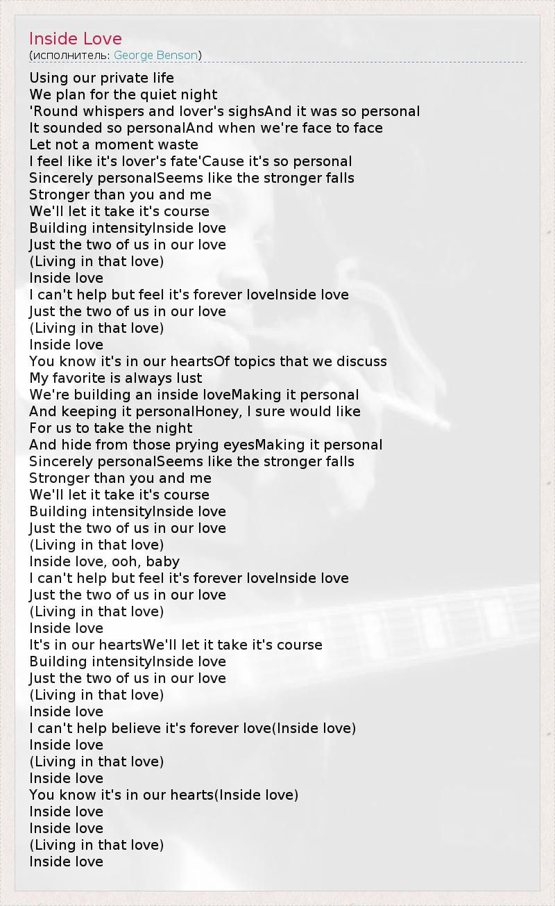 Using our private life We plan for the quiet night 'Round whispers and lover's sighsAnd it was so personal It sounded so personalAnd when we're face to face Let not a moment waste I feel like it's lover's fate'Cause it's so personal Sincerely personalSeems like the stronger falls Stronger than you and me We'll let it take it's course Building intensityInside love Just the two of us in our love (Living in that love) Inside love I can't help but feel it's forever loveInside love Just the two of us in our love (Living in that love) Inside love You know it's in our heartsOf topics that we discuss My favorite is always lust We're building an inside loveMaking it personal And keeping it personalHoney, I sure would like For us to take the night And hide from those prying eyesMaking it personal Sincerely personalSeems like the stronger falls Stronger than you and me We'll let it take it's course Building intensityInside love Just the two of us in our love (Living in that love) Inside love, ooh, baby I can't help but feel it's forever loveInside love Just the two of us in our love (Living in that love) Inside love It's in our heartsWe'll let it take it's course Building intensityInside love Just the two of us in our love (Living in that love) Inside love I can't help believe it's forever love(Inside love) Inside love (Living in that love) Inside love You know it's in our hearts(Inside love) Inside love Inside love (Living in that love) Inside love