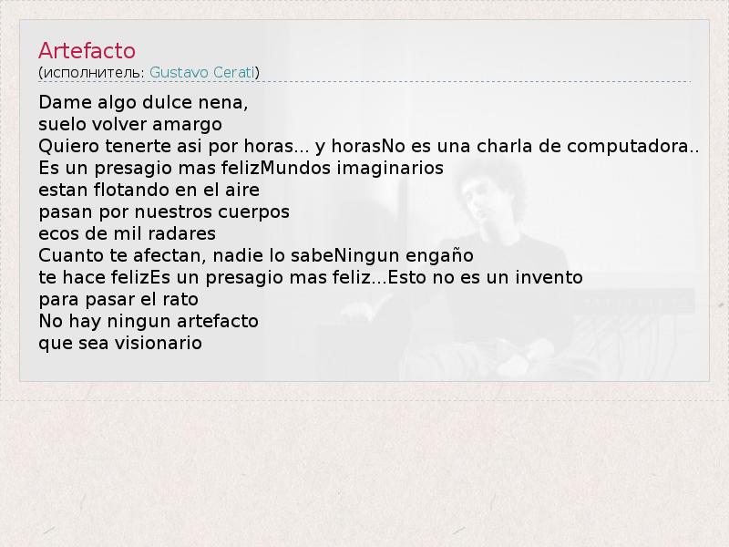 Это интересно:Gustavo Adrián Cerati Clark - Густаво Серати (родился в Буэнос-Айресе, 11 августа 1959 года). Аргентинский певец, композитор и гитарист. В 80-90-ые годы входил в состав известной аргентинской рок-группы Soda Stereo, вместе с Чарли Альберти (Charly Alberti) и Зета Босио (Zeta Bosio). После распада группы начал сольную карьеру с дебютным альбомом "Amor Amarillo" (в записи заглавного трека принял участие и Hector (Zeta)... продолжение