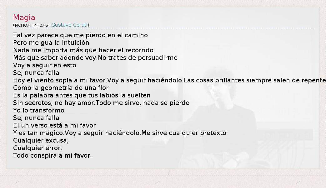 Это интересно:Gustavo Adrián Cerati Clark - Густаво Серати (родился в Буэнос-Айресе, 11 августа 1959 года). Аргентинский певец, композитор и гитарист. В 80-90-ые годы входил в состав известной аргентинской рок-группы Soda Stereo, вместе с Чарли Альберти (Charly Alberti) и Зета Босио (Zeta Bosio). После распада группы начал сольную карьеру с дебютным альбомом "Amor Amarillo" (в записи заглавного трека принял участие и Hector (Zeta)... продолжение