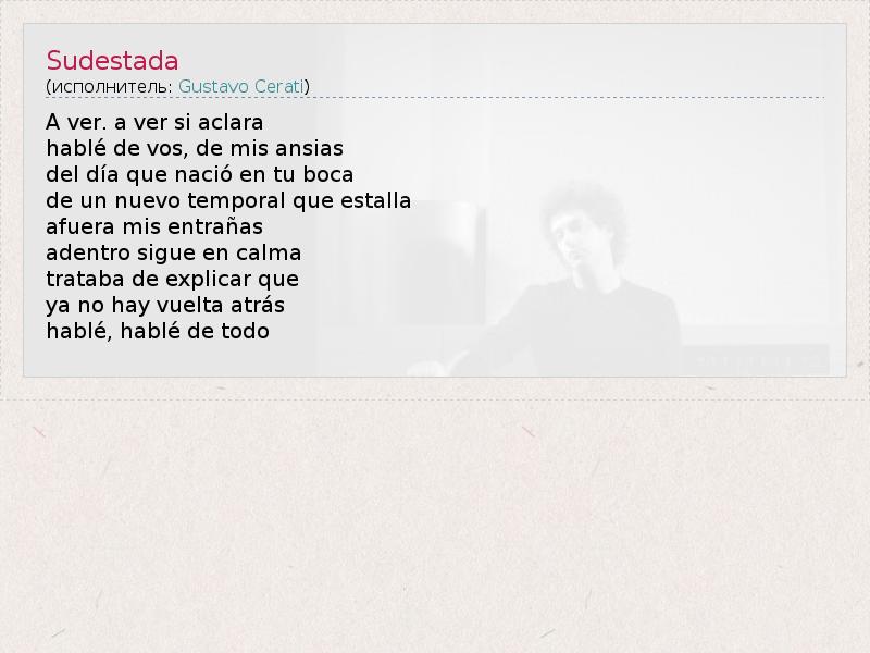 Это интересно:Gustavo Adrián Cerati Clark - Густаво Серати (родился в Буэнос-Айресе, 11 августа 1959 года). Аргентинский певец, композитор и гитарист. В 80-90-ые годы входил в состав известной аргентинской рок-группы Soda Stereo, вместе с Чарли Альберти (Charly Alberti) и Зета Босио (Zeta Bosio). После распада группы начал сольную карьеру с дебютным альбомом "Amor Amarillo" (в записи заглавного трека принял участие и Hector (Zeta)... продолжение