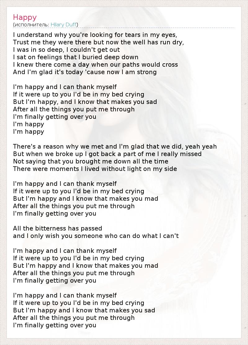 Я понимаю, почему ты ищешь слёзы на моих глазах. Поверь мне, они там были, но уже высохли. Я была так погружена в себя, я не могла выбраться. У меня были чувства, которые я захоронила глубоко. Я знала, что придёт день, когда наши пути пересекутся И я рада, что этот день - сегодня, потому что сейчас я сильна. Я счастлива, и я могу поблагодарить за это себя. Хотя ты бы хотел, чтобы я сейчас плакала в своей постели. Но я счастлива, и я знаю, что тебя это огорчает. После всего, что ты мне причинил, Я, в конце концов, одержала верх, Я счастлива, Я счастлива… В нашей встрече есть смысл, и я рада, что это мы встретились. Да, да... А когда мы порвали, я вернула назад ту часть себя , о которой я действительно забыла. Сейчас я говорю, что ты всегда меня унижал Временами мне было нелегко Я счастлива, и я могу поблагодарить за это себя. Хотя ты бы хотел, чтобы я сейчас плакала в своей постели. Но я счастлива, и я знаю, что тебя это огорчает. После всего, что ты мне причинил, Я, в конце концов, одержала верх. Горечь уже прошла И я всего лишь желаю тебе найти ту, которая сможет то, чего не смогла я. Я счастлива, и я могу поблагодарить за это себя, Хотя ты бы хотел, чтобы я сейчас плакала в своей постели. Но я счастлива, и я знаю, что тебя это огорчает. После всего, что ты мне причинил, Я, в конце концов, одержала верх. Я счастлива, и я могу поблагодарить за это себя. Хотя ты бы хотел, чтобы я сейчас плакала в своей постели. Но я счастлива, и я знаю, что тебя это огорчает. После всего, что ты мне причинил, Я, в конце концов, одержала верх.