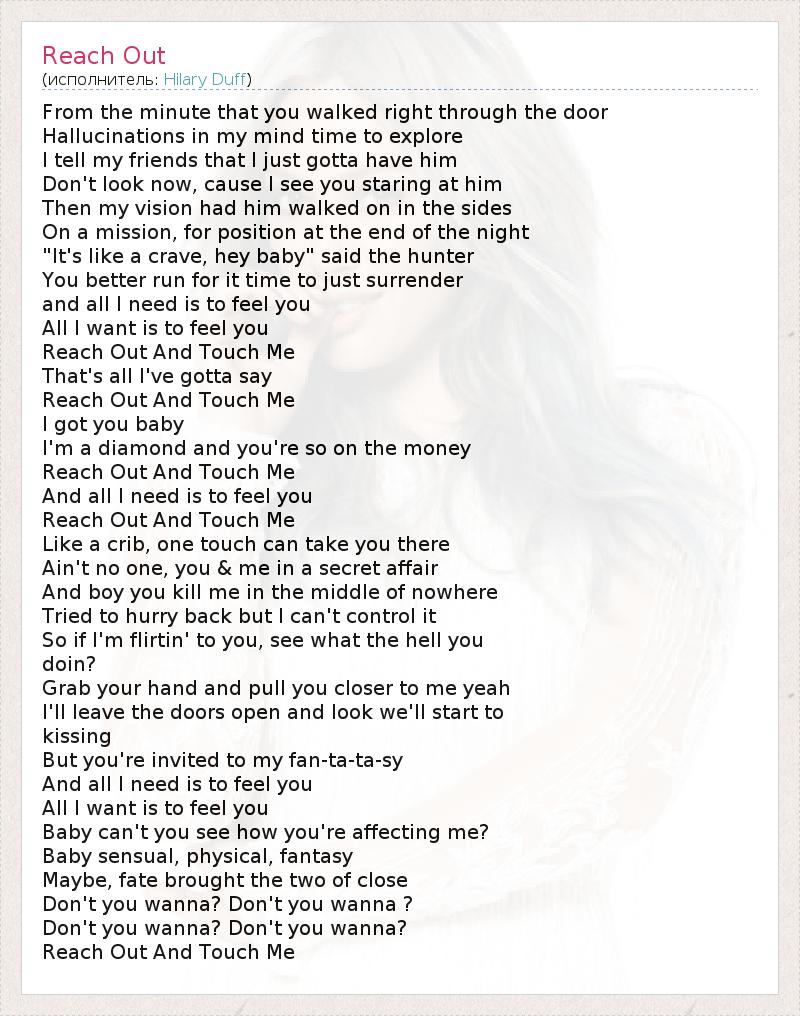 From the minute that you walked right through the door Hallucinations in my mind time to explore I tell my friends that I just gotta have him Don't look now, cause I see you staring at him Then my vision had him walked on in the sides On a mission, for position at the end of the night "It's like a crave, hey baby" said the hunter You better run for it time to just surrender and all I need is to feel you All I want is to feel you Reach Out And Touch Me That's all I've gotta say Reach Out And Touch Me I got you baby I'm a diamond and you're so on the money Reach Out And Touch Me And all I need is to feel you Reach Out And Touch Me Like a crib, one touch can take you there Ain't no one, you & me in a secret affair And boy you kill me in the middle of nowhere Tried to hurry back but I can't control it So if I'm flirtin' to you, see what the hell you doin? Grab your hand and pull you closer to me yeah I'll leave the doors open and look we'll start to kissing But you're invited to my fan-ta-ta-sy And all I need is to feel you All I want is to feel you Baby can't you see how you're affecting me? Baby sensual, physical, fantasy Maybe, fate brought the two of close Don't you wanna? Don't you wanna ? Don't you wanna? Don't you wanna? Reach Out And Touch Me