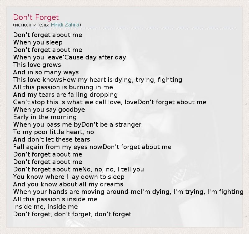 Don't forget about me When you sleep Don't forget about me When you leave'Cause day after day This love grows And in so many ways This love knowsHow my heart is dying, trying, fighting All this passion is burning in me And my tears are falling dropping Can't stop this is what we call love, loveDon't forget about me When you say goodbye Early in the morning When you pass me byDon't be a stranger To my poor little heart, no And don't let these tears Fall again from my eyes nowDon't forget about me Don't forget about me Don't forget about me Don't forget about meNo, no, no, I tell you You know where I lay down to sleep And you know about all my dreams When your hands are moving around meI'm dying, I'm trying, I'm fighting All this passion's inside me Inside me, inside me Don't forget, don't forget, don't forget