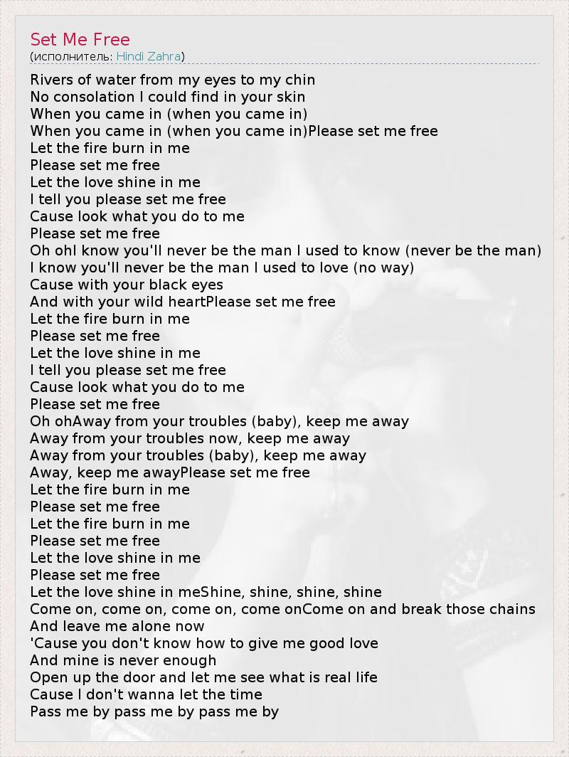 Rivers of water from my eyes to my chin No consolation I could find in your skin When you came in (when you came in) When you came in (when you came in)Please set me free Let the fire burn in me Please set me free Let the love shine in me I tell you please set me free Cause look what you do to me Please set me free Oh ohI know you'll never be the man I used to know (never be the man) I know you'll never be the man I used to love (no way) Cause with your black eyes And with your wild heartPlease set me free Let the fire burn in me Please set me free Let the love shine in me I tell you please set me free Cause look what you do to me Please set me free Oh ohAway from your troubles (baby), keep me away Away from your troubles now, keep me away Away from your troubles (baby), keep me away Away, keep me awayPlease set me free Let the fire burn in me Please set me free Let the fire burn in me Please set me free Let the love shine in me Please set me free Let the love shine in meShine, shine, shine, shine Come on, come on, come on, come onCome on and break those chains And leave me alone now 'Cause you don't know how to give me good love And mine is never enough Open up the door and let me see what is real life Cause I don't wanna let the time Pass me by pass me by pass me by
