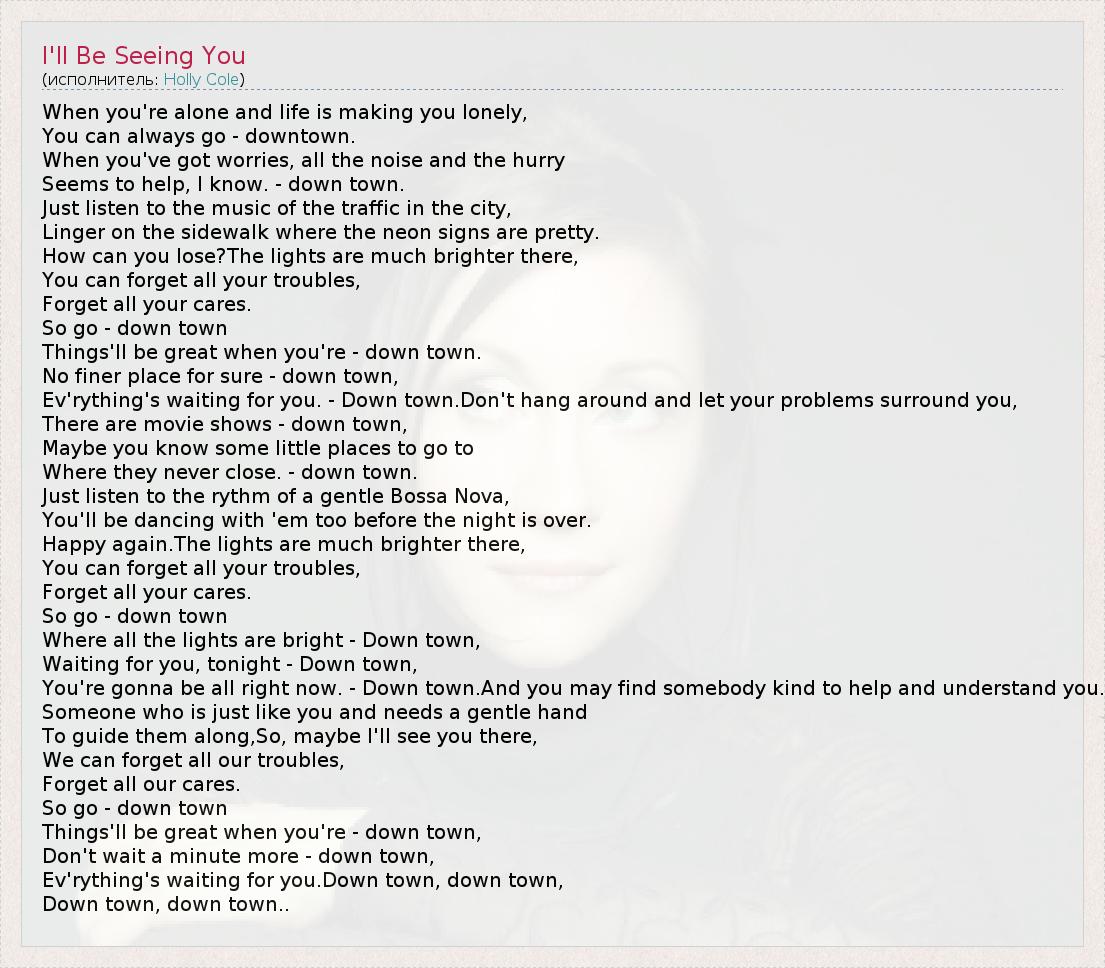 When you're alone and life is making you lonely, You can always go - downtown. When you've got worries, all the noise and the hurry Seems to help, I know. - down town. Just listen to the music of the traffic in the city, Linger on the sidewalk where the neon signs are pretty. How can you lose?The lights are much brighter there, You can forget all your troubles, Forget all your cares. So go - down town Things'll be great when you're - down town. No finer place for sure - down town, Ev'rything's waiting for you. - Down town.Don't hang around and let your problems surround you, There are movie shows - down town, Maybe you know some little places to go to Where they never close. - down town. Just listen to the rythm of a gentle Bossa Nova, You'll be dancing with 'em too before the night is over. Happy again.The lights are much brighter there, You can forget all your troubles, Forget all your cares. So go - down town Where all the lights are bright - Down town, Waiting for you, tonight - Down town, You're gonna be all right now. - Down town.And you may find somebody kind to help and understand you. Someone who is just like you and needs a gentle hand To guide them along,So, maybe I'll see you there, We can forget all our troubles, Forget all our cares. So go - down town Things'll be great when you're - down town, Don't wait a minute more - down town, Ev'rything's waiting for you.Down town, down town, Down town, down town..