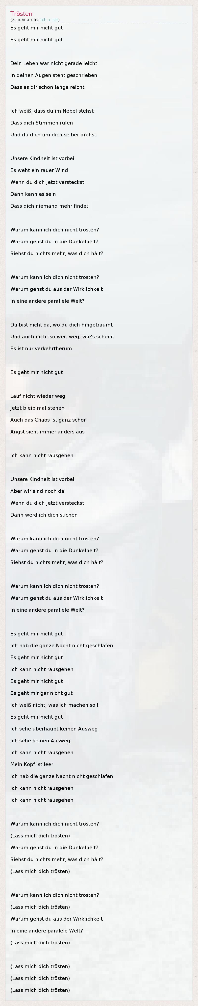 Es geht mir nicht gut Es geht mir nicht gut Dein Leben war nicht gerade leicht In deinen Augen steht geschrieben Dass es dir schon lange reicht Ich weiß, dass du im Nebel stehst Dass dich Stimmen rufen Und du dich um dich selber drehst Unsere Kindheit ist vorbei Es weht ein rauer Wind Wenn du dich jetzt versteckst Dann kann es sein Dass dich niemand mehr findet Warum kann ich dich nicht trösten? Warum gehst du in die Dunkelheit? Siehst du nichts mehr, was dich hält? Warum kann ich dich nicht trösten? Warum gehst du aus der Wirklichkeit In eine andere parallele Welt? Du bist nicht da, wo du dich hingeträumt Und auch nicht so weit weg, wie's scheint Es ist nur verkehrtherum Es geht mir nicht gut Lauf nicht wieder weg Jetzt bleib mal stehen Auch das Chaos ist ganz schön Angst sieht immer anders aus Ich kann nicht rausgehen Unsere Kindheit ist vorbei Aber wir sind noch da Wenn du dich jetzt versteckst Dann werd ich dich suchen Warum kann ich dich nicht trösten? Warum gehst du in die Dunkelheit? Siehst du nichts mehr, was dich hält? Warum kann ich dich nicht trösten? Warum gehst du aus der Wirklichkeit In eine andere parallele Welt? Es geht mir nicht gut Ich hab die ganze Nacht nicht geschlafen Es geht mir nicht gut Ich kann nicht rausgehen Es geht mir nicht gut Es geht mir gar nicht gut Ich weiß nicht, was ich machen soll Es geht mir nicht gut Ich sehe überhaupt keinen Ausweg Ich sehe keinen Ausweg Ich kann nicht rausgehen Mein Kopf ist leer Ich hab die ganze Nacht nicht geschlafen Ich kann nicht rausgehen Ich kann nicht rausgehen Warum kann ich dich nicht trösten? (Lass mich dich trösten) Warum gehst du in die Dunkelheit? Siehst du nichts mehr, was dich hält? (Lass mich dich trösten) Warum kann ich dich nicht trösten? (Lass mich dich trösten) Warum gehst du aus der Wirklichkeit In eine andere paralele Welt? (Lass mich dich trösten) (Lass mich dich trösten) (Lass mich dich trösten) (Lass mich dich trösten)