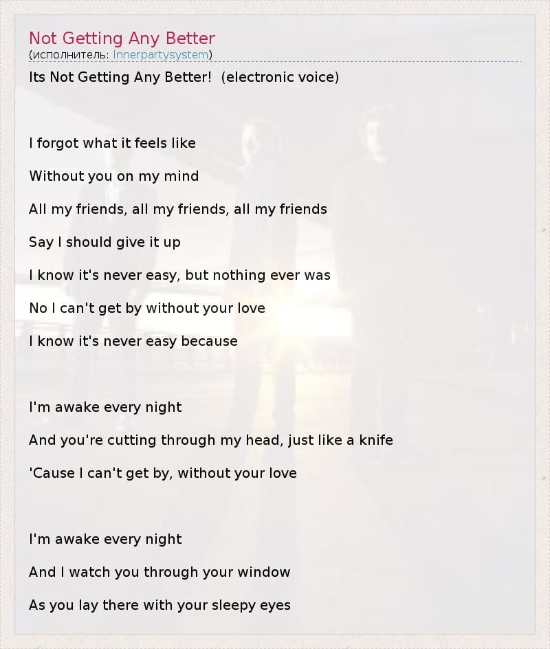Its Not Getting Any Better! (electronic voice) I forgot what it feels like Without you on my mind All my friends, all my friends, all my friends Say I should give it up I know it's never easy, but nothing ever was No I can't get by without your love I know it's never easy because I'm awake every night And you're cutting through my head, just like a knife 'Cause I can't get by, without your love I'm awake every night And I watch you through your window As you lay there with your sleepy eyes