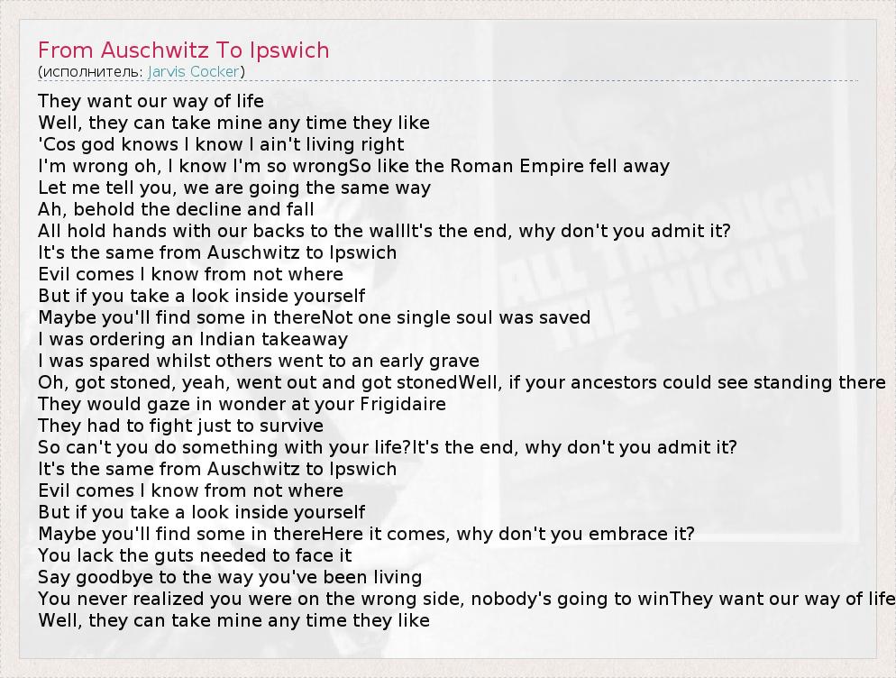 А как ты думаешь, о чем песня "From Auschwitz To Ipswich" ?
