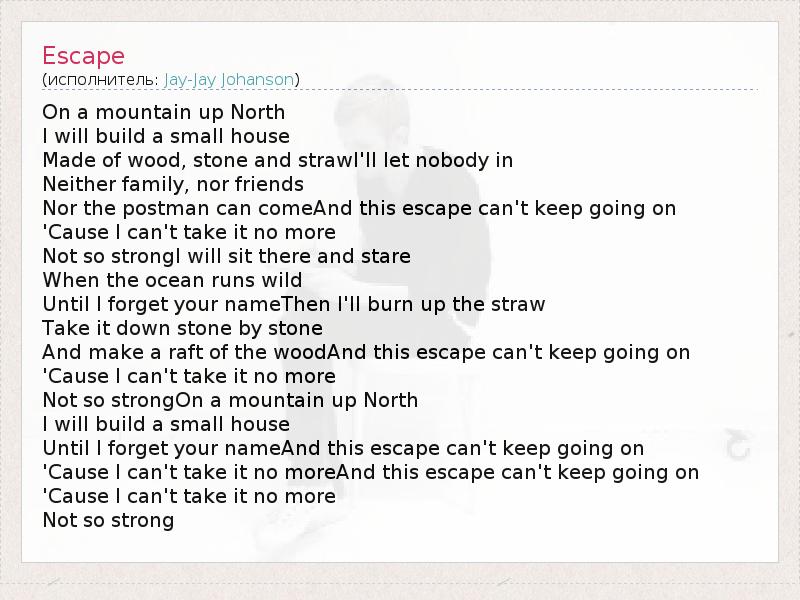 'Cause I can't take it no moreAnd this escape can't keep going on
