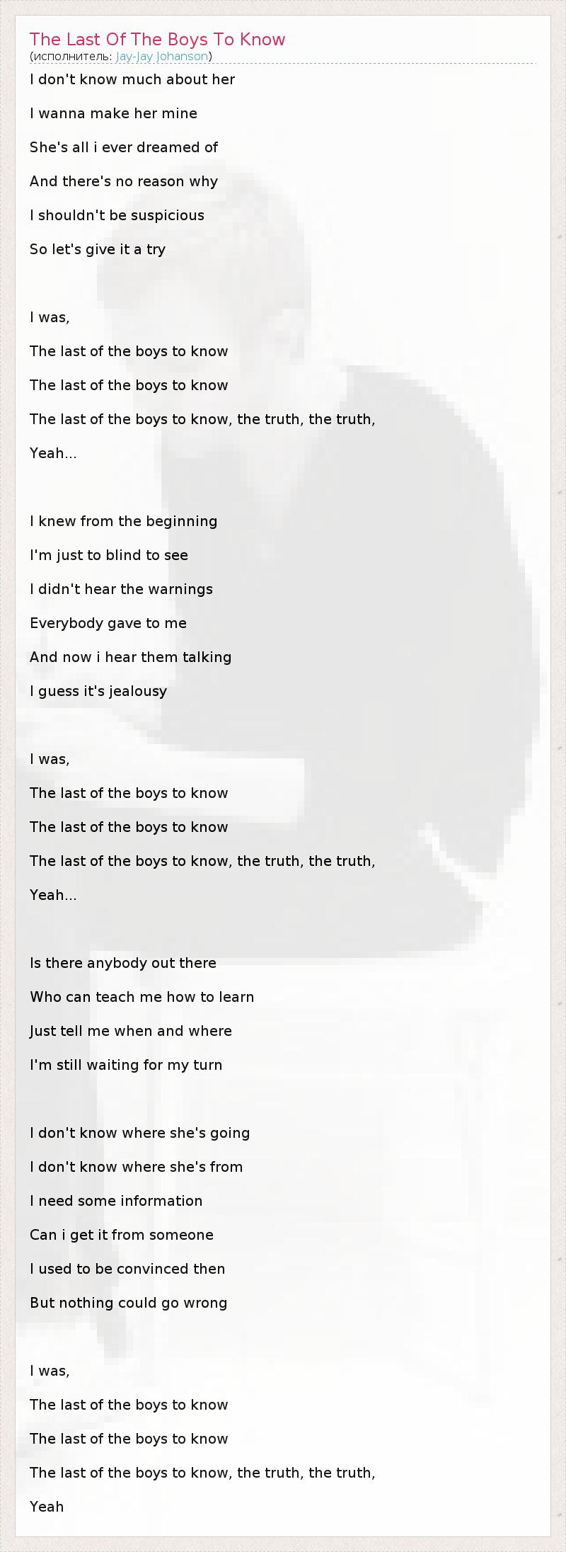 ГлавнаяИсполнителиJay-Jay JohansonThe Last Of The Boys To Know