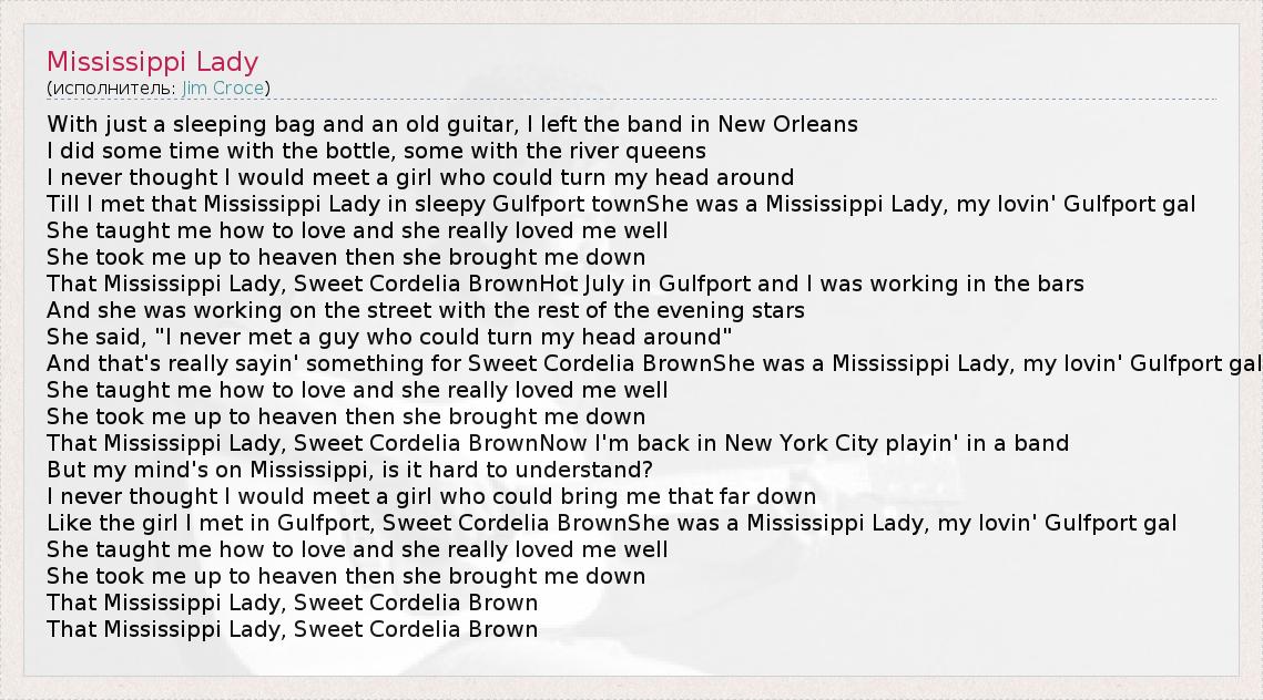 А как ты думаешь, о чем песня "Mississippi Lady" ?