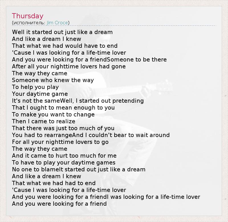 Это интересно:Певец, гитарист и композитор Джим Кроус родился 10 января 1943 года, умер 20 сентября 1973 года в США.Кроус профессионально начал играть на гитаре в 18 лет - он специализировался главным образом на фолк-роке с блюзовой «подкладкой». В 1967 году музыкант переехал в Нью -Йорк, в 1969 году подписал контракт с фирмой Capitol и в начале 70-х записал ряд хит-синглов, которые до сих пор считаются классикой фолк-блюза... продолжение