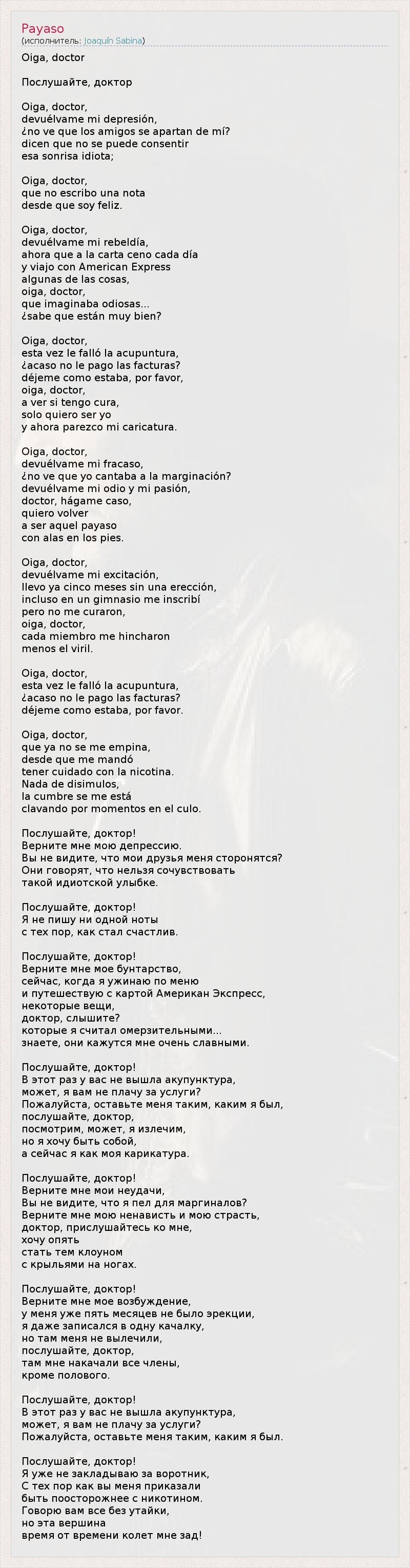 Это интересно:Хоаки́н Рамо́н Марти́нес Саби́на (исп. Joaquín Ramón Martínez Sabina, род. 12 февраля 1949, Убеда, Испания) — испанский рок-поэт, певец, композитор; один из столпов современной испаноязычной поп и рок-культуры. Автор-исполнитель, поставивший своё имя в один ряд с именами Боба Дилана, Жака Бреля, Сержа Генсбура или Бориса Гребенщикова, сходным образом оказавших влияние на культуру стран родного языка.Родился... продолжение