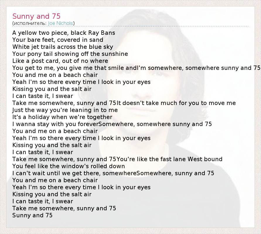 A yellow two piece, black Ray Bans Your bare feet, covered in sand White jet trails across the blue sky Your pony tail showing off the sunshine Like a ṗost card, out of no where You get to me, you give me that smile andI'm somewhere, somewhere sunny and 75 You and me on a beach chair Yeah I'm so there every time I look in your eyes Kissing you and the salt air I can taste it, I swear Take me somewhere, sunny and 75It doesn't take much for you to move me Just the way you're leaning in to me It's a holiday when we're together I wanna stay with you foreverSomewhere, somewhere sunny and 75 You and me on a beach chair Yeah I'm so there every time I look in your eyes Kissing you and the salt air I can taste it, I swear Take me somewhere, sunny and 75You're like the fast lane West bound You feel like the window's rolled down I can't wait until we get there, somewhereSomewhere, sunny and 75 You and me on a beach chair Yeah I'm so there every time I look in your eyes Kissing you and the salt air I can taste it, I swear Take me somewhere, sunny and 75 Sunny and 75