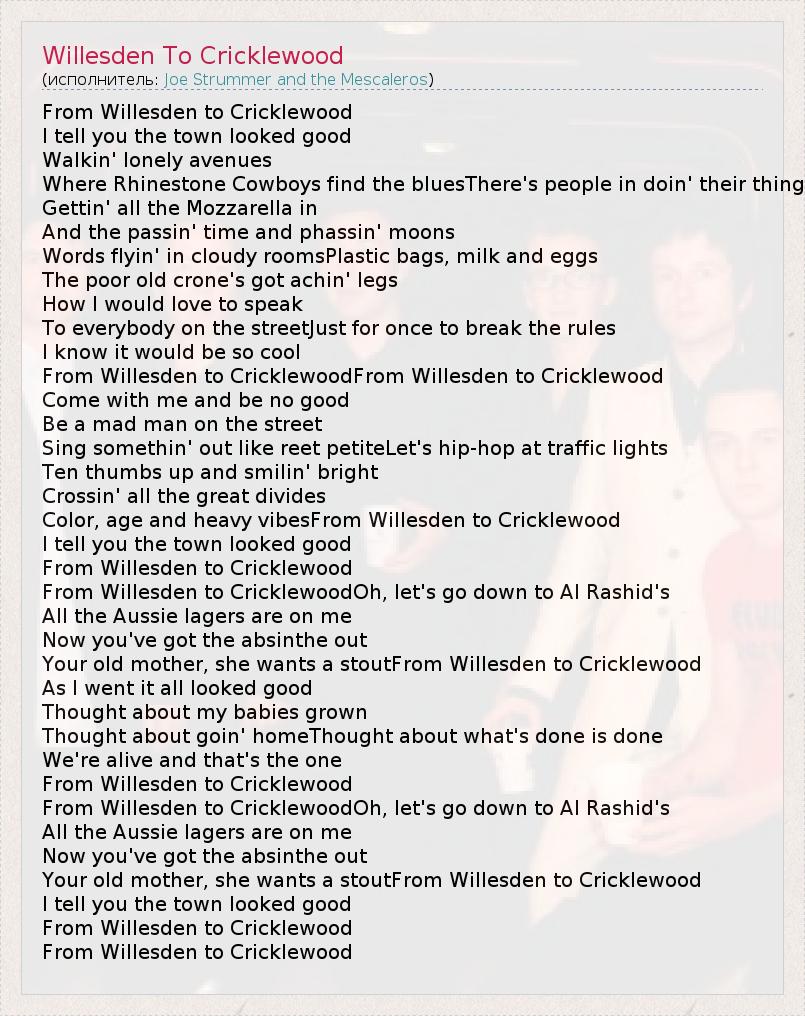 From Willesden to Cricklewood I tell you the town looked good Walkin' lonely avenues Where Rhinestone Cowboys find the bluesThere's people in doin' their thing Gettin' all the Mozzarella in And the passin' time and phassin' moons Words flyin' in cloudy roomsPlastic bags, milk and eggs The poor old crone's got achin' legs How I would love to speak To everybody on the streetJust for once to break the rules I know it would be so cool From Willesden to CricklewoodFrom Willesden to Cricklewood Come with me and be no good Be a mad man on the street Sing somethin' out like reet petiteLet's hip-hop at traffic lights Ten thumbs up and smilin' bright Crossin' all the great divides Color, age and heavy vibesFrom Willesden to Cricklewood I tell you the town looked good From Willesden to Cricklewood From Willesden to CricklewoodOh, let's go down to Al Rashid's All the Aussie lagers are on me Now you've got the absinthe out Your old mother, she wants a stoutFrom Willesden to Cricklewood As I went it all looked good Thought about my babies grown Thought about goin' homeThought about what's done is done We're alive and that's the one From Willesden to Cricklewood From Willesden to CricklewoodOh, let's go down to Al Rashid's All the Aussie lagers are on me Now you've got the absinthe out Your old mother, she wants a stoutFrom Willesden to Cricklewood I tell you the town looked good From Willesden to Cricklewood From Willesden to Cricklewood