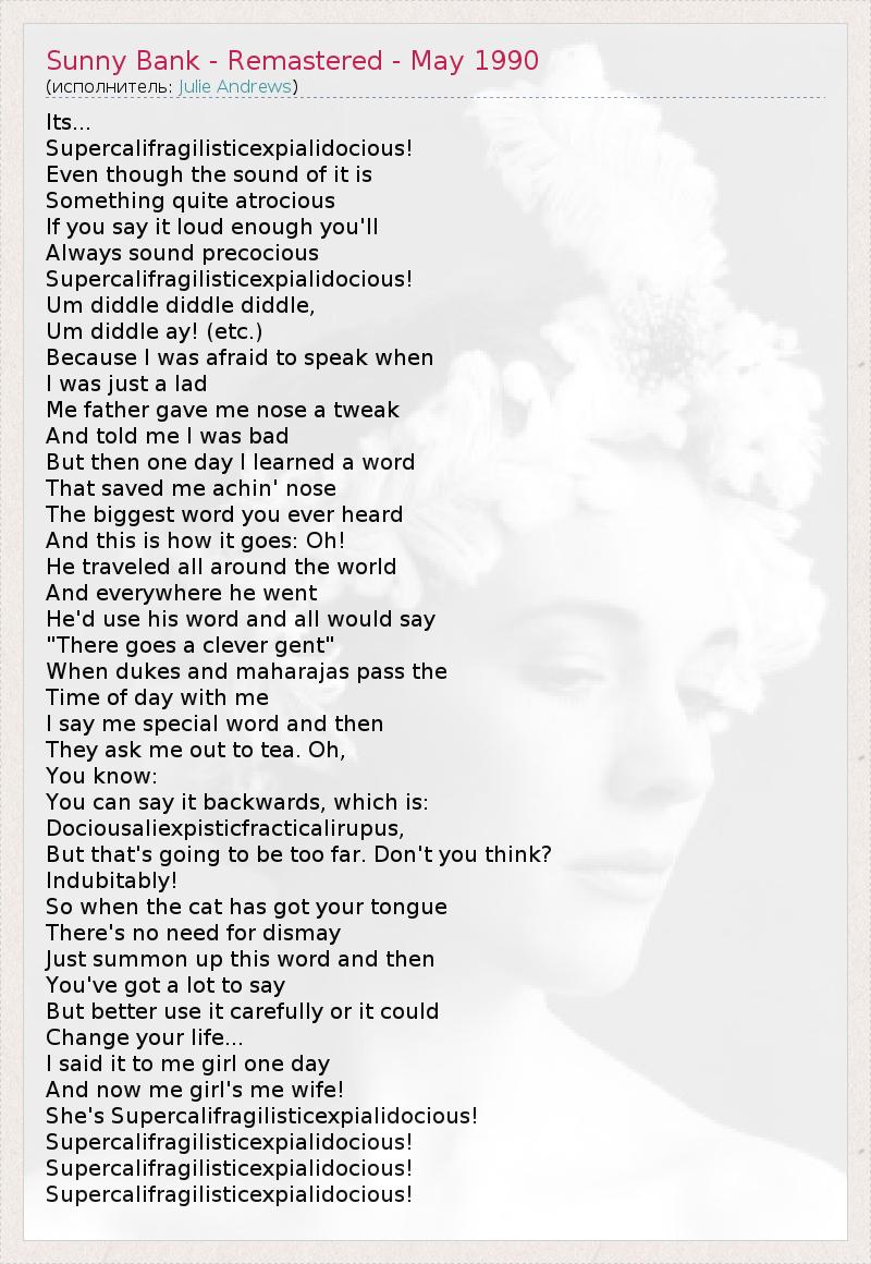 Its... Supercalifragilisticexpialidocious! Even though the sound of it is Something quite atrocious If you say it loud enough you'll Always sound precocious Supercalifragilisticexpialidocious! Um diddle diddle diddle, Um diddle ay! (etc.) Because I was afraid to speak when I was just a lad Me father gave me nose a tweak And told me I was bad But then one day I learned a word That saved me achin' nose The biggest word you ever heard And this is how it goes: Oh! He traveled all around the world And everywhere he went He'd use his word and all would say "There goes a clever gent" When dukes and maharajas pass the Time of day with me I say me special word and then They ask me out to tea. Oh, You know: You can say it backwards, which is: Dociousaliexpisticfracticalirupus, But that's going to be too far. Don't you think? Indubitably! So when the cat has got your tongue There's no need for dismay Just summon up this word and then You've got a lot to say But better use it carefully or it could Change your life... I said it to me girl one day And now me girl's me wife! She's Supercalifragilisticexpialidocious! Supercalifragilisticexpialidocious! Supercalifragilisticexpialidocious! Supercalifragilisticexpialidocious!
