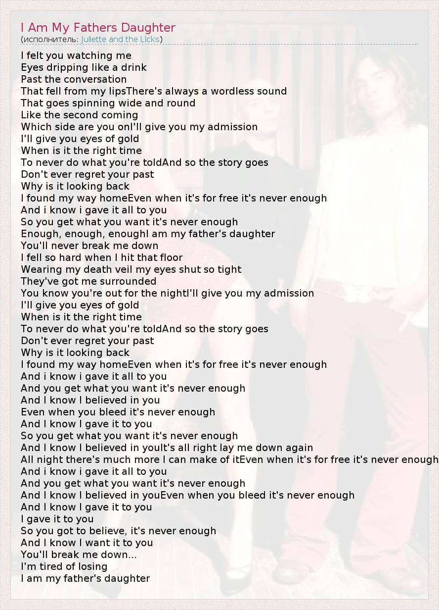 I felt you watching me Eyes dripping like a drink Past the conversation That fell from my lipsThere's always a wordless sound That goes spinning wide and round Like the second coming Which side are you onI'll give you my admission I'll give you eyes of gold When is it the right time To never do what you're toldAnd so the story goes Don't ever regret your past Why is it looking back I found my way homeEven when it's for free it's never enough And i know i gave it all to you So you get what you want it's never enough Enough, enough, enoughI am my father's daughter You'll never break me down I fell so hard when I hit that floor Wearing my death veil my eyes shut so tight They've got me surrounded You know you're out for the nightI'll give you my admission I'll give you eyes of gold When is it the right time To never do what you're toldAnd so the story goes Don't ever regret your past Why is it looking back I found my way homeEven when it's for free it's never enough And i know i gave it all to you And you get what you want it's never enough And I know I believed in you Even when you bleed it's never enough And I know I gave it to you So you get what you want it's never enough And I know I believed in youIt's all right lay me down again All night there's much more I can make of itEven when it's for free it's never enough And i know i gave it all to you And you get what you want it's never enough And I know I believed in youEven when you bleed it's never enough And I know I gave it to you I gave it to you So you got to believe, it's never enough And I know I want it to you You'll break me down... I'm tired of losing I am my father's daughter