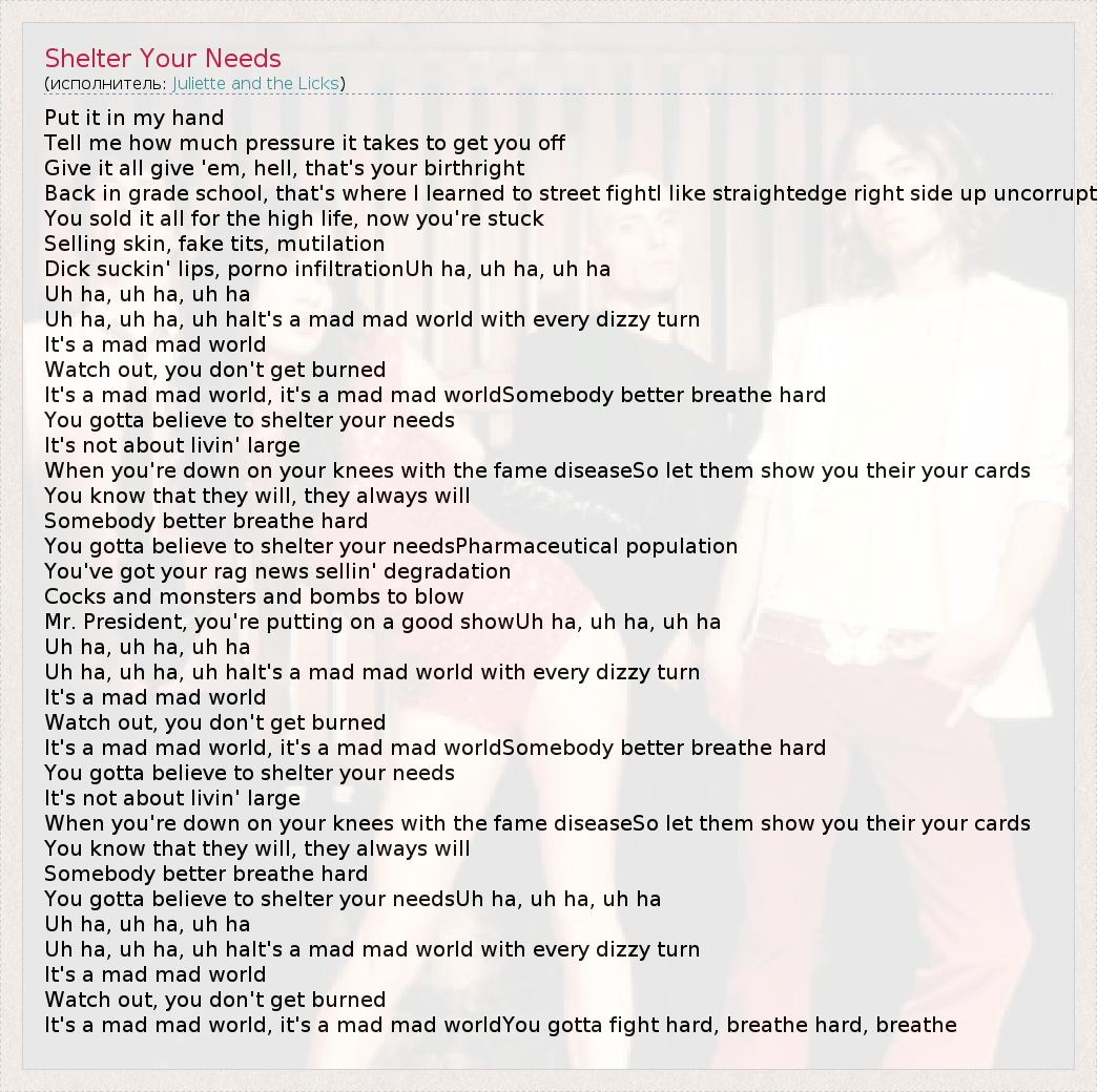 А как ты думаешь, о чем песня "Shelter Your Needs" ?