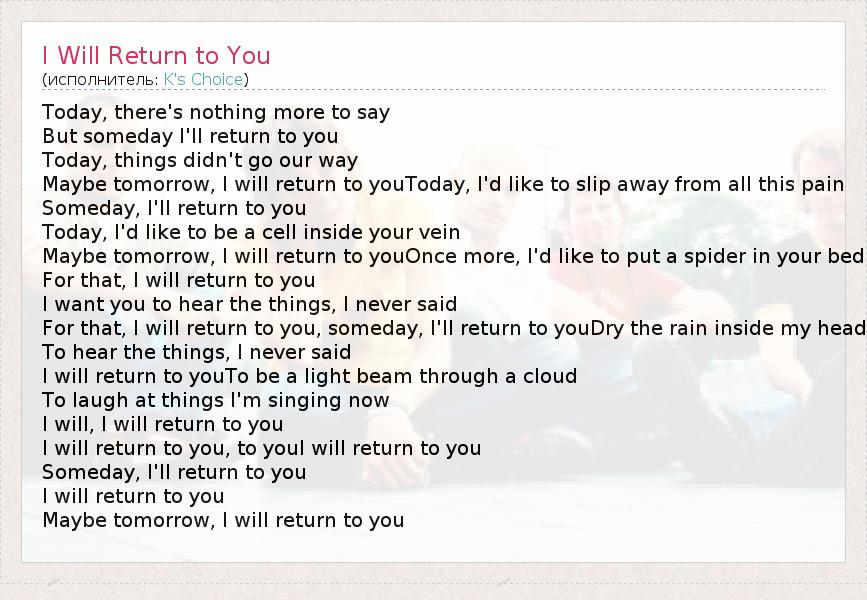 А как ты думаешь, о чем песня "I Will Return to You" ?