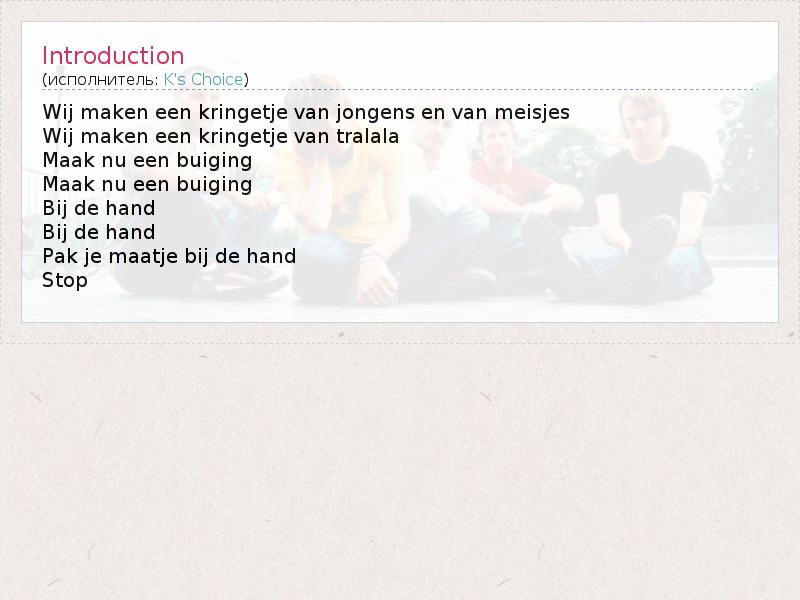 Это интересно:K’s Choice - бельгийская рок-группа из Антверпена. Их стиль можно охарактеризовать как гитарный рок, или фолк-рок.Состав:Сара Беттенс - вокал, гитара.Герт Беттенс - гитара, клавишные, вокал.Эрик Гроссман - бас-гитара.Ян ван Сихем младший - гитара.Коен Лиекенс - ударные.В настоящий момент участники группы работают над сольным проектами. Сара Беттенс выпустила альбом под... продолжение