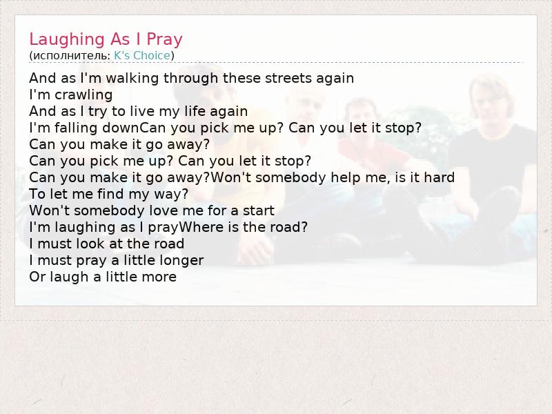 А как ты думаешь, о чем песня "Laughing As I Pray" ?