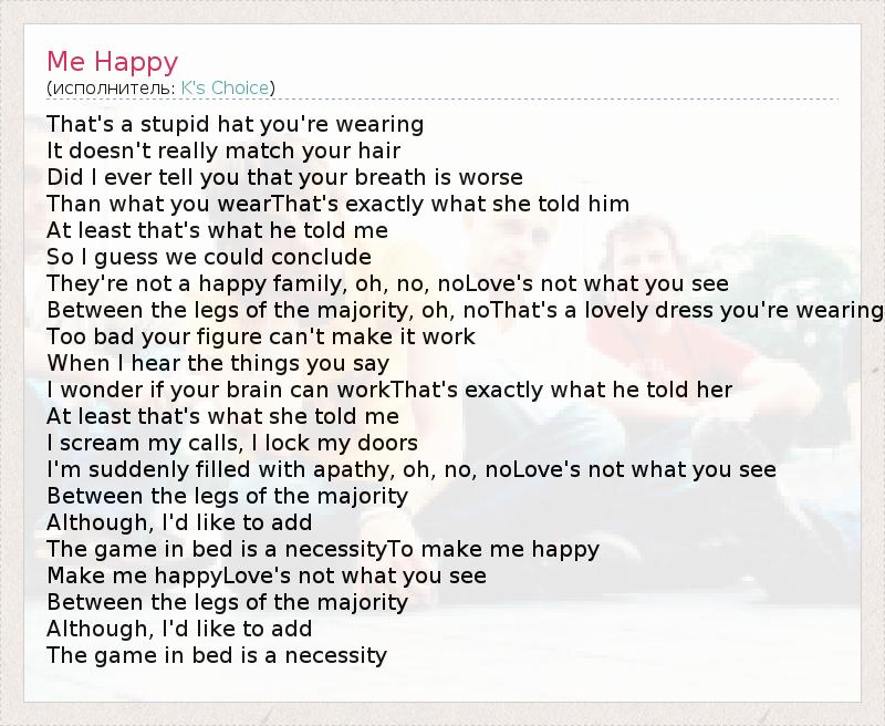 Это интересно:K’s Choice - бельгийская рок-группа из Антверпена. Их стиль можно охарактеризовать как гитарный рок, или фолк-рок.Состав:Сара Беттенс - вокал, гитара.Герт Беттенс - гитара, клавишные, вокал.Эрик Гроссман - бас-гитара.Ян ван Сихем младший - гитара.Коен Лиекенс - ударные.В настоящий момент участники группы работают над сольным проектами. Сара Беттенс выпустила альбом под... продолжение