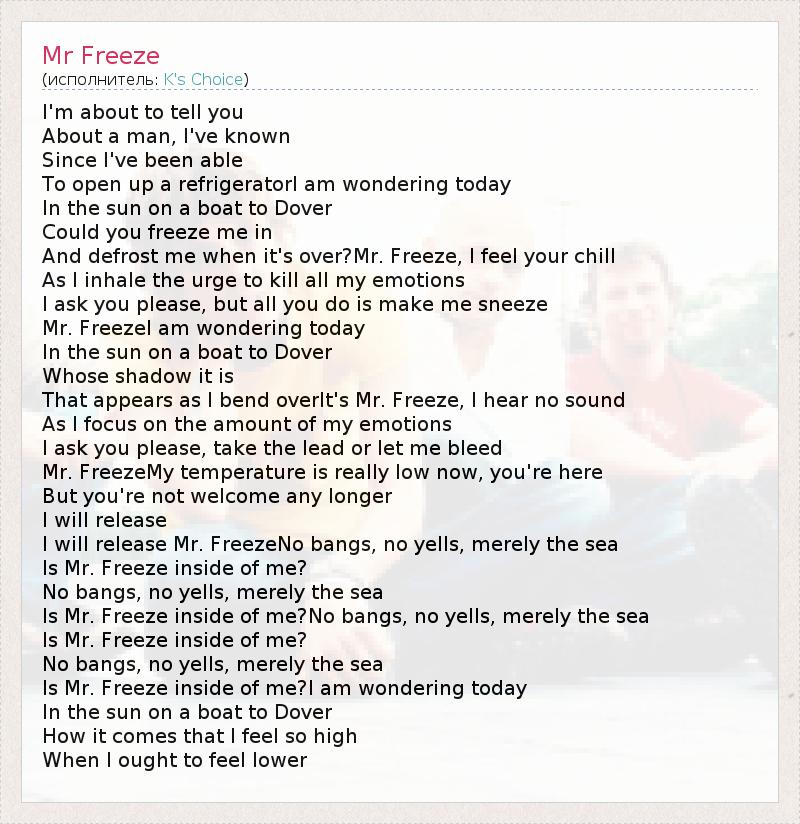 I'm about to tell you About a man, I've known Since I've been able To open up a refrigeratorI am wondering today In the sun on a boat to Dover Could you freeze me in And defrost me when it's over?Mr. Freeze, I feel your chill As I inhale the urge to kill all my emotions I ask you please, but all you do is make me sneeze Mr. FreezeI am wondering today In the sun on a boat to Dover Whose shadow it is That appears as I bend overIt's Mr. Freeze, I hear no sound As I focus on the amount of my emotions I ask you please, take the lead or let me bleed Mr. FreezeMy temperature is really low now, you're here But you're not welcome any longer I will release I will release Mr. FreezeNo bangs, no yells, merely the sea Is Mr. Freeze inside of me? No bangs, no yells, merely the sea Is Mr. Freeze inside of me?No bangs, no yells, merely the sea Is Mr. Freeze inside of me? No bangs, no yells, merely the sea Is Mr. Freeze inside of me?I am wondering today In the sun on a boat to Dover How it comes that I feel so high When I ought to feel lower