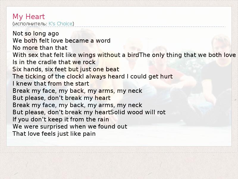 Not so long ago We both felt love became a word No more than that With sex that felt like wings without a birdThe only thing that we both love Is in the cradle that we rock Six hands, six feet but just one beat The ticking of the clockI always heard I could get hurt I knew that from the start Break my face, my back, my arms, my neck But please, don't break my heart Break my face, my back, my arms, my neck But please, don't break my heartSolid wood will rot If you don't keep it from the rain We were surprised when we found out That love feels just like pain