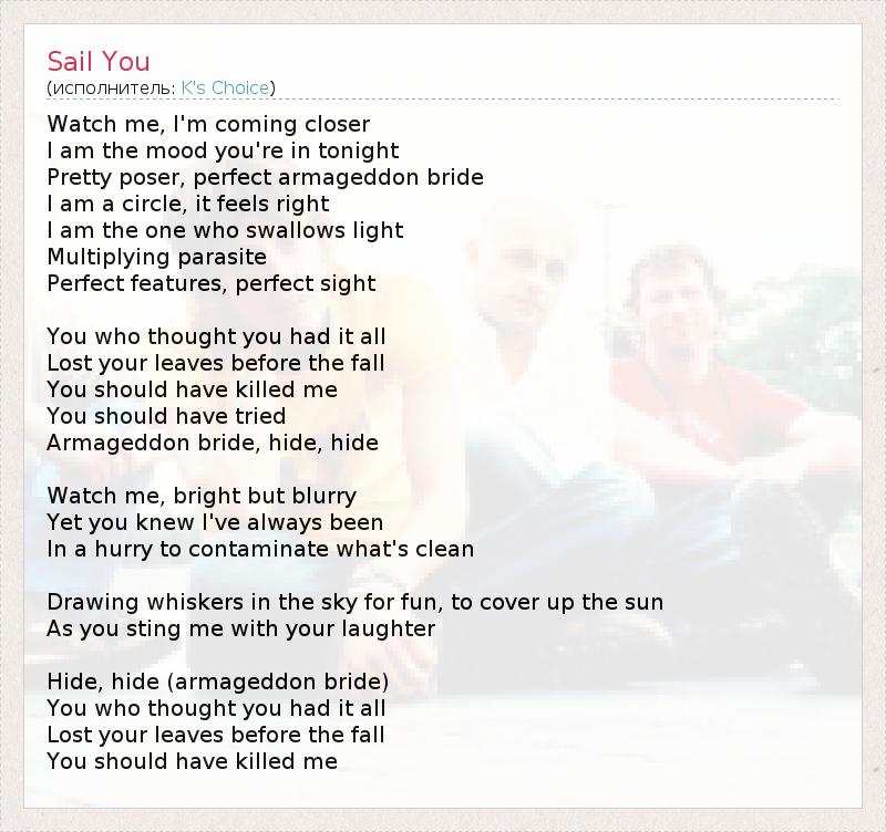 Это интересно:K’s Choice - бельгийская рок-группа из Антверпена. Их стиль можно охарактеризовать как гитарный рок, или фолк-рок.Состав:Сара Беттенс - вокал, гитара.Герт Беттенс - гитара, клавишные, вокал.Эрик Гроссман - бас-гитара.Ян ван Сихем младший - гитара.Коен Лиекенс - ударные.В настоящий момент участники группы работают над сольным проектами. Сара Беттенс выпустила альбом под... продолжение