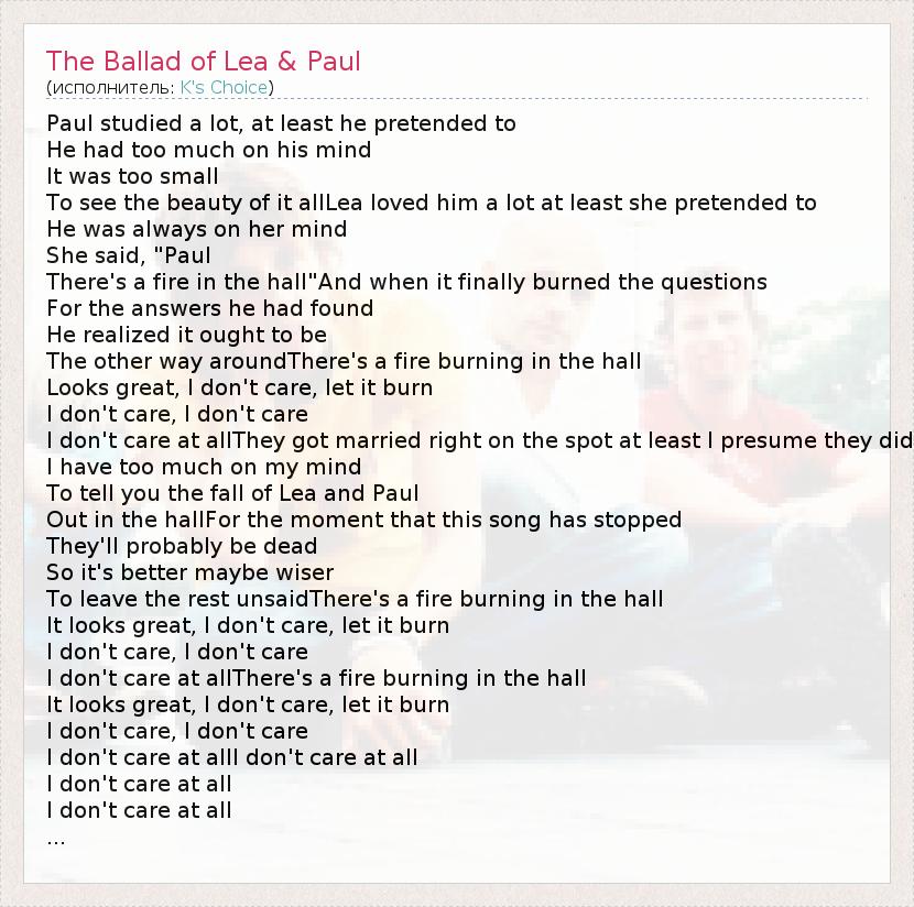 Paul studied a lot, at least he pretended to He had too much on his mind It was too small To see the beauty of it allLea loved him a lot at least she pretended to He was always on her mind She said, "Paul There's a fire in the hall"And when it finally burned the questions For the answers he had found He realized it ought to be The other way aroundThere's a fire burning in the hall Looks great, I don't care, let it burn I don't care, I don't care I don't care at allThey got married right on the spot at least I presume they did I have too much on my mind To tell you the fall of Lea and Paul Out in the hallFor the moment that this song has stopped They'll probably be dead So it's better maybe wiser To leave the rest unsaidThere's a fire burning in the hall It looks great, I don't care, let it burn I don't care, I don't care I don't care at allThere's a fire burning in the hall It looks great, I don't care, let it burn I don't care, I don't care I don't care at allI don't care at all I don't care at all I don't care at all ...