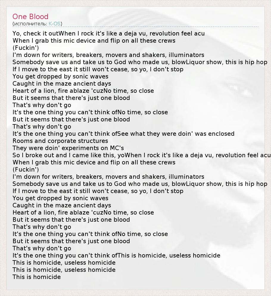 Yo, check it outWhen I rock it's like a deja vu, revolution feel acu When I grab this mic device and flip on all these crews (Fuckin') I'm down for writers, breakers, movers and shakers, illuminators Somebody save us and take us to God who made us, blowLiquor show, this is hip hop If I move to the east it still won't cease, so yo, I don't stop You get dropped by sonic waves Caught in the maze ancient days Heart of a lion, fire ablaze 'cuzNo time, so close But it seems that there's just one blood That's why don't go It's the one thing you can't think ofNo time, so close But it seems that there's just one blood That's why don't go It's the one thing you can't think ofSee what they were doin' was enclosed Rooms and corporate structures They were doin' experiments on MC's So I broke out and I came like this, yoWhen I rock it's like a deja vu, revolution feel acu When I grab this mic device and flip on all these crews (Fuckin') I'm down for writers, breakers, movers and shakers, illuminators Somebody save us and take us to God who made us, blowLiquor show, this is hip hop If I move to the east it still won't cease, so yo, I don't stop You get dropped by sonic waves Caught in the maze ancient days Heart of a lion, fire ablaze 'cuzNo time, so close But it seems that there's just one blood That's why don't go It's the one thing you can't think ofNo time, so close But it seems that there's just one blood That's why don't go It's the one thing you can't think ofThis is homicide, useless homicide This is homicide, useless homicide This is homicide, useless homicide This is homicide