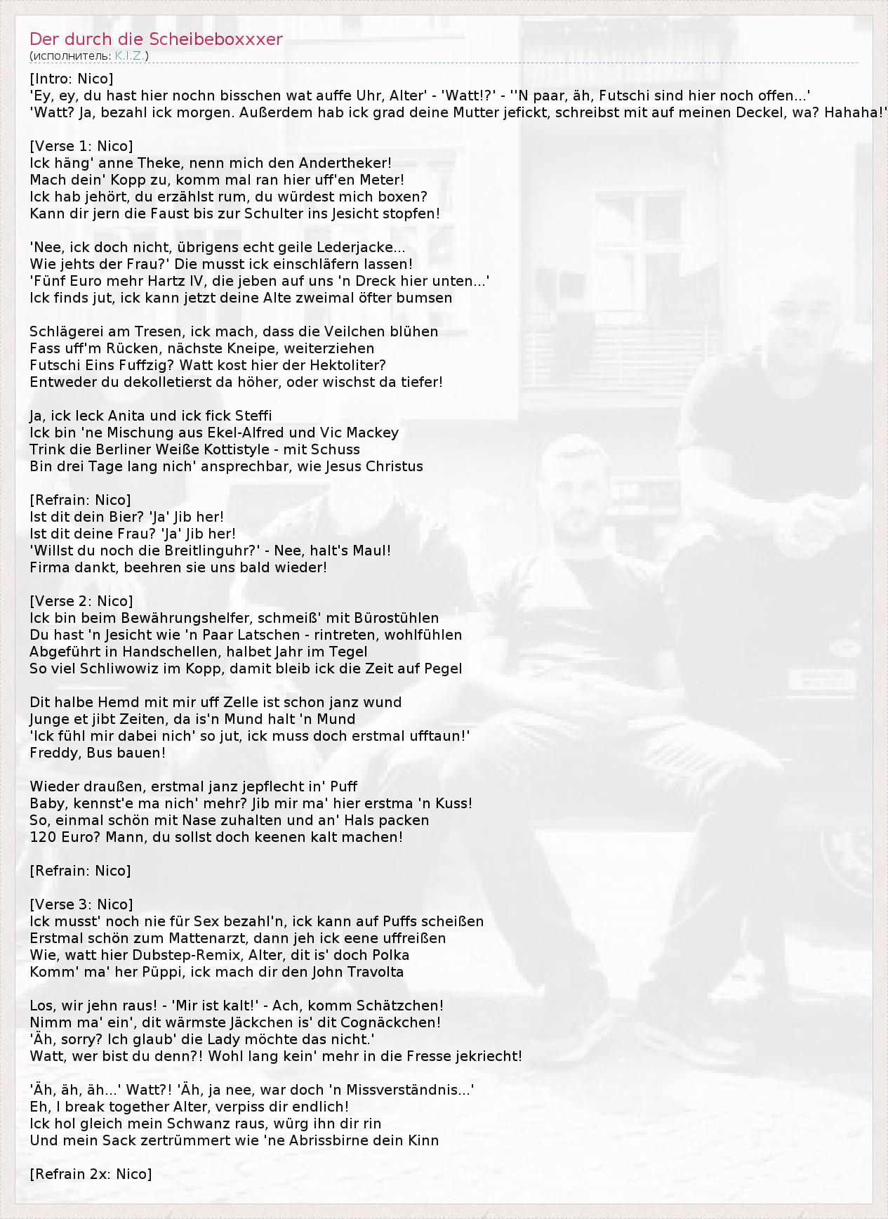 [Intro: Nico] 'Ey, ey, du hast hier nochn bisschen wat auffe Uhr, Alter' - 'Watt!?' - ''N paar, äh, Futschi sind hier noch offen...' 'Watt? Ja, bezahl ick morgen. Außerdem hab ick grad deine Mutter jefickt, schreibst mit auf meinen Deckel, wa? Hahaha!' [Verse 1: Nico] Ick häng' anne Theke, nenn mich den Andertheker! Mach dein' Kopp zu, komm mal ran hier uff'en Meter! Ick hab jehört, du erzählst rum, du würdest mich boxen? Kann dir jern die Faust bis zur Schulter ins Jesicht stopfen! 'Nee, ick doch nicht, übrigens echt geile Lederjacke... Wie jehts der Frau?' Die musst ick einschläfern lassen! 'Fünf Euro mehr Hartz IV, die jeben auf uns 'n Dreck hier unten...' Ick finds jut, ick kann jetzt deine Alte zweimal öfter bumsen Schlägerei am Tresen, ick mach, dass die Veilchen blühen Fass uff'm Rücken, nächste Kneipe, weiterziehen Futschi Eins Fuffzig? Watt kost hier der Hektoliter? Entweder du dekolletierst da höher, oder wischst da tiefer! Ja, ick leck Anita und ick fick Steffi Ick bin 'ne Mischung aus Ekel-Alfred und Vic Mackey Trink die Berliner Weiße Kottistyle - mit Schuss Bin drei Tage lang nich' ansprechbar, wie Jesus Christus [Refrain: Nico] Ist dit dein Bier? 'Ja' Jib her! Ist dit deine Frau? 'Ja' Jib her! 'Willst du noch die Breitlinguhr?' - Nee, halt's Maul! Firma dankt, beehren sie uns bald wieder! [Verse 2: Nico] Ick bin beim Bewährungshelfer, schmeiß' mit Bürostühlen Du hast 'n Jesicht wie 'n Paar Latschen - rintreten, wohlfühlen Abgeführt in Handschellen, halbet Jahr im Tegel So viel Schliwowiz im Kopp, damit bleib ick die Zeit auf Pegel Dit halbe Hemd mit mir uff Zelle ist schon janz wund Junge et jibt Zeiten, da is'n Mund halt 'n Mund 'Ick fühl mir dabei nich' so jut, ick muss doch erstmal ufftaun!' Freddy, Bus bauen! Wieder draußen, erstmal janz jepflecht in' Puff Baby, kennst'e ma nich' mehr? Jib mir ma' hier erstma 'n Kuss! So, einmal schön mit Nase zuhalten und an' Hals packen 120 Euro? Mann, du sollst doch keenen kalt machen! [Refrain: Nico] [Verse 3: Nico] Ick musst' noch nie für Sex bezahl'n, ick kann auf Puffs scheißen Erstmal schön zum Mattenarzt, dann jeh ick eene uffreißen Wie, watt hier Dubstep-Remix, Alter, dit is' doch Polka Komm' ma' her Püppi, ick mach dir den John Travolta Los, wir jehn raus! - 'Mir ist kalt!' - Ach, komm Schätzchen! Nimm ma' ein', dit wärmste Jäckchen is' dit Cognäckchen! 'Äh, sorry? Ich glaub' die Lady möchte das nicht.' Watt, wer bist du denn?! Wohl lang kein' mehr in die Fresse jekriecht! 'Äh, äh, äh...' Watt?! 'Äh, ja nee, war doch 'n Missverständnis...' Eh, I break together Alter, verpiss dir endlich! Ick hol gleich mein Schwanz raus, würg ihn dir rin Und mein Sack zertrümmert wie 'ne Abrissbirne dein Kinn [Refrain 2x: Nico]