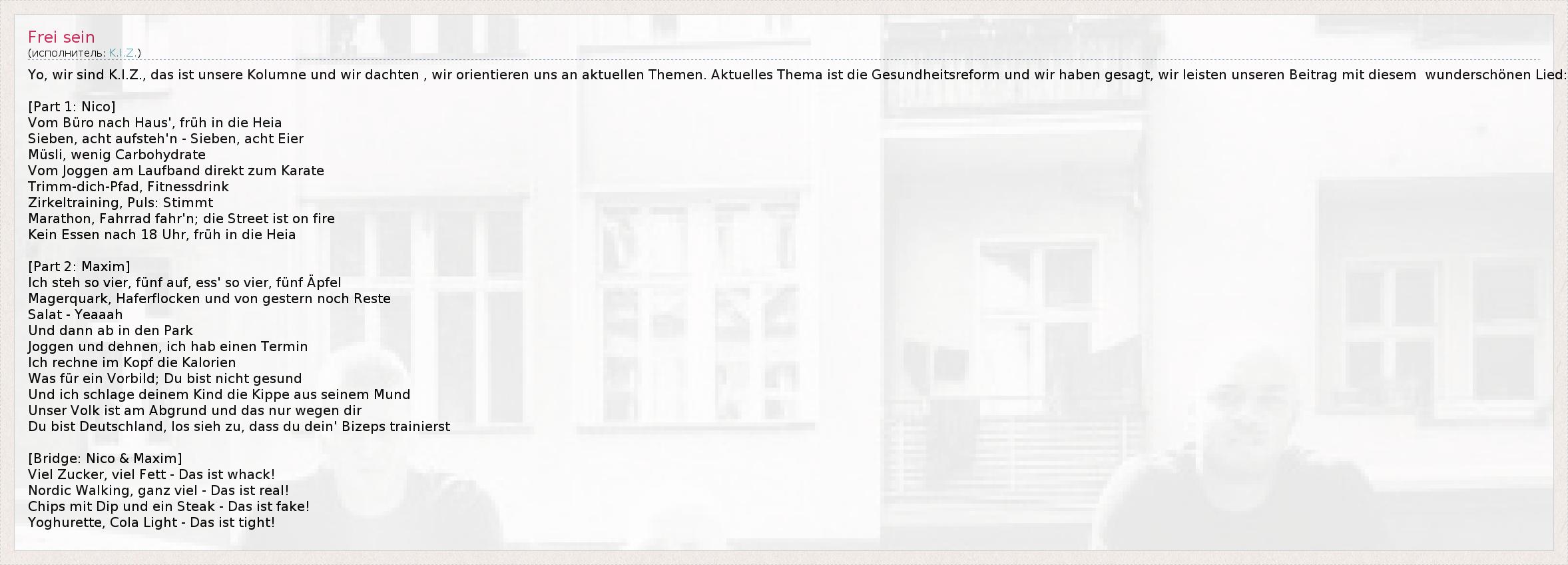 Yo, wir sind K.I.Z., das ist unsere Kolumne und wir dachten , wir orientieren uns an aktuellen Themen. Aktuelles Thema ist die Gesundheitsreform und wir haben gesagt, wir leisten unseren Beitrag mit diesem  wunderschönen Lied: