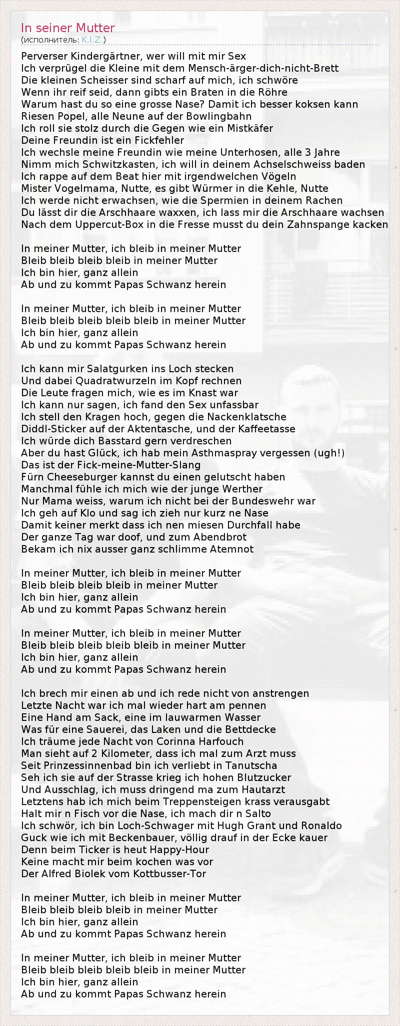 Perverser Kindergärtner, wer will mit mir Sex Ich verprügel die Kleine mit dem Mensch-ärger-dich-nicht-Brett Die kleinen Scheisser sind scharf auf mich, ich schwöre Wenn ihr reif seid, dann gibts ein Braten in die Röhre Warum hast du so eine grosse Nase? Damit ich besser koksen kann Riesen Popel, alle Neune auf der Bowlingbahn Ich roll sie stolz durch die Gegen wie ein Mistkäfer Deine Freundin ist ein Fickfehler Ich wechsle meine Freundin wie meine Unterhosen, alle 3 Jahre Nimm mich Schwitzkasten, ich will in deinem Achselschweiss baden Ich rappe auf dem Beat hier mit irgendwelchen Vögeln Mister Vogelmama, Nutte, es gibt Würmer in die Kehle, Nutte Ich werde nicht erwachsen, wie die Spermien in deinem Rachen Du lässt dir die Arschhaare waxxen, ich lass mir die Arschhaare wachsen Nach dem Uppercut-Box in die Fresse musst du dein Zahnspange kacken In meiner Mutter, ich bleib in meiner Mutter Bleib bleib bleib bleib in meiner Mutter Ich bin hier, ganz allein Ab und zu kommt Papas Schwanz herein In meiner Mutter, ich bleib in meiner Mutter Bleib bleib bleib bleib bleib in meiner Mutter Ich bin hier, ganz allein Ab und zu kommt Papas Schwanz herein Ich kann mir Salatgurken ins Loch stecken Und dabei Quadratwurzeln im Kopf rechnen Die Leute fragen mich, wie es im Knast war Ich kann nur sagen, ich fand den Sex unfassbar Ich stell den Kragen hoch, gegen die Nackenklatsche Diddl-Sticker auf der Aktentasche, und der Kaffeetasse Ich würde dich Basstard gern verdreschen Aber du hast Glück, ich hab mein Asthmaspray vergessen (ugh!) Das ist der Fick-meine-Mutter-Slang Fürn Cheeseburger kannst du einen gelutscht haben Manchmal fühle ich mich wie der junge Werther Nur Mama weiss, warum ich nicht bei der Bundeswehr war Ich geh auf Klo und sag ich zieh nur kurz ne Nase Damit keiner merkt dass ich nen miesen Durchfall habe Der ganze Tag war doof, und zum Abendbrot Bekam ich nix ausser ganz schlimme Atemnot In meiner Mutter, ich bleib in meiner Mutter Bleib bleib bleib bleib in meiner Mutter Ich bin hier, ganz allein Ab und zu kommt Papas Schwanz herein In meiner Mutter, ich bleib in meiner Mutter Bleib bleib bleib bleib bleib in meiner Mutter Ich bin hier, ganz allein Ab und zu kommt Papas Schwanz herein Ich brech mir einen ab und ich rede nicht von anstrengen Letzte Nacht war ich mal wieder hart am pennen Eine Hand am Sack, eine im lauwarmen Wasser Was für eine Sauerei, das Laken und die Bettdecke Ich träume jede Nacht von Corinna Harfouch Man sieht auf 2 Kilometer, dass ich mal zum Arzt muss Seit Prinzessinnenbad bin ich verliebt in Tanutscha Seh ich sie auf der Strasse krieg ich hohen Blutzucker Und Ausschlag, ich muss dringend ma zum Hautarzt Letztens hab ich mich beim Treppensteigen krass verausgabt Halt mir n Fisch vor die Nase, ich mach dir n Salto Ich schwör, ich bin Loch-Schwager mit Hugh Grant und Ronaldo Guck wie ich mit Beckenbauer, völlig drauf in der Ecke kauer Denn beim Ticker is heut Happy-Hour Keine macht mir beim kochen was vor Der Alfred Biolek vom Kottbusser-Tor In meiner Mutter, ich bleib in meiner Mutter Bleib bleib bleib bleib in meiner Mutter Ich bin hier, ganz allein Ab und zu kommt Papas Schwanz herein In meiner Mutter, ich bleib in meiner Mutter Bleib bleib bleib bleib bleib in meiner Mutter Ich bin hier, ganz allein Ab und zu kommt Papas Schwanz herein