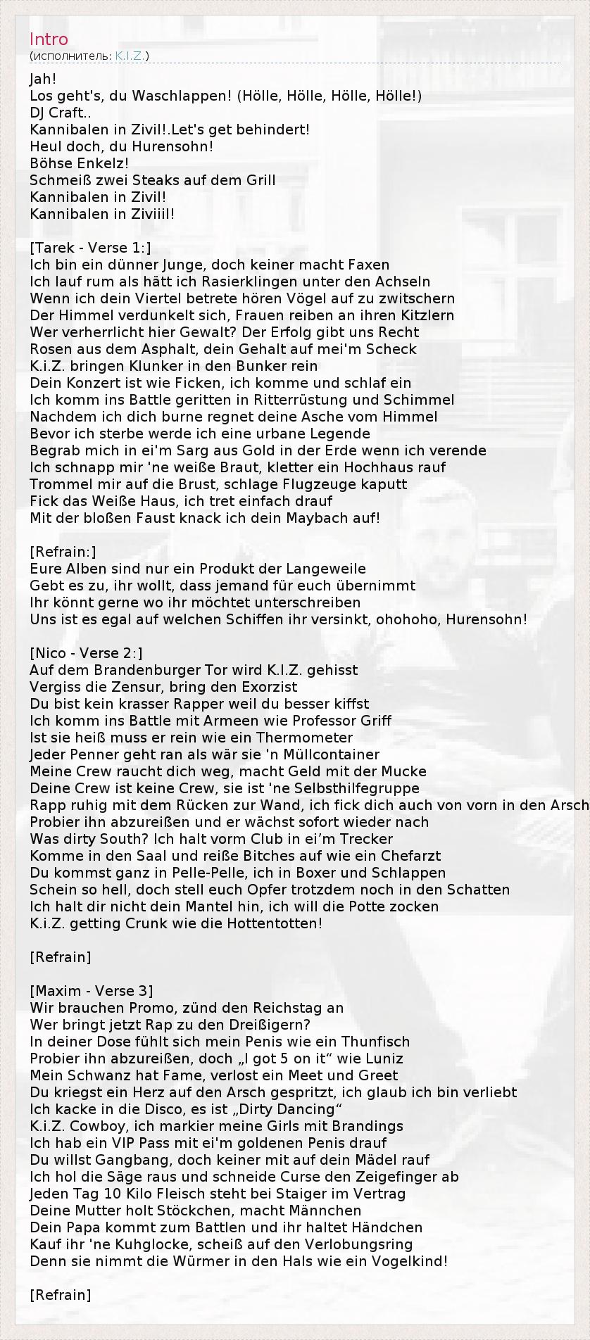 Это интересно:K.I.Z. это немецкая хип-хоп команда из Берлина. K.I.Z., по их собственному мнению, создали новый стиль немецкой рэп музыки, называя его "смесью панка и техно". Это прежде всего рэп батлы, как правило, заполненые большим количеством иронии и черного юмора. Группа состоит из четырех человек: Тарек, Максим, Нико (так известный как € 8000) и DJ Craft.Имеется несколько версий рассшифровки аббревиатуры... продолжение