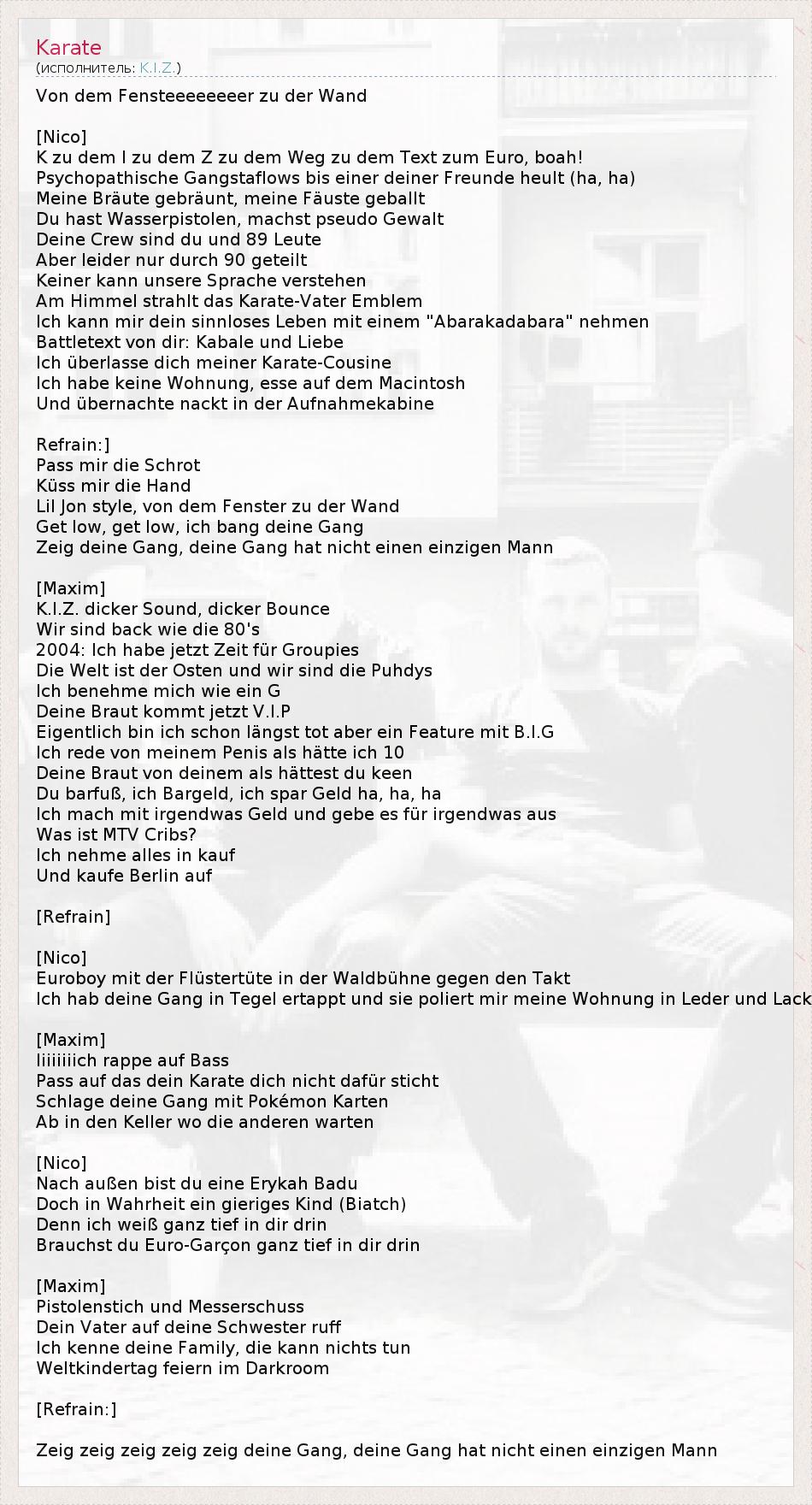 Это интересно:K.I.Z. это немецкая хип-хоп команда из Берлина. K.I.Z., по их собственному мнению, создали новый стиль немецкой рэп музыки, называя его "смесью панка и техно". Это прежде всего рэп батлы, как правило, заполненые большим количеством иронии и черного юмора. Группа состоит из четырех человек: Тарек, Максим, Нико (так известный как € 8000) и DJ Craft.Имеется несколько версий рассшифровки аббревиатуры... продолжение