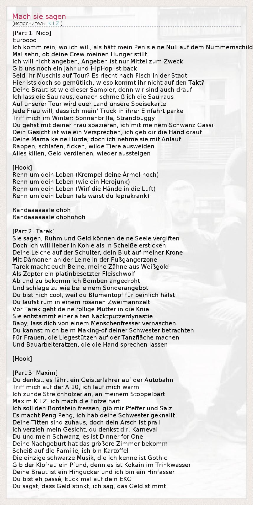 Это интересно:K.I.Z. это немецкая хип-хоп команда из Берлина. K.I.Z., по их собственному мнению, создали новый стиль немецкой рэп музыки, называя его "смесью панка и техно". Это прежде всего рэп батлы, как правило, заполненые большим количеством иронии и черного юмора. Группа состоит из четырех человек: Тарек, Максим, Нико (так известный как € 8000) и DJ Craft.Имеется несколько версий рассшифровки аббревиатуры... продолжение