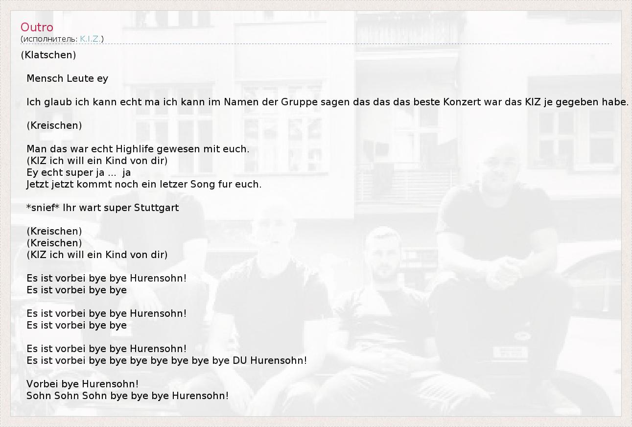 Это интересно:K.I.Z. это немецкая хип-хоп команда из Берлина. K.I.Z., по их собственному мнению, создали новый стиль немецкой рэп музыки, называя его "смесью панка и техно". Это прежде всего рэп батлы, как правило, заполненые большим количеством иронии и черного юмора. Группа состоит из четырех человек: Тарек, Максим, Нико (так известный как € 8000) и DJ Craft.Имеется несколько версий рассшифровки аббревиатуры... продолжение