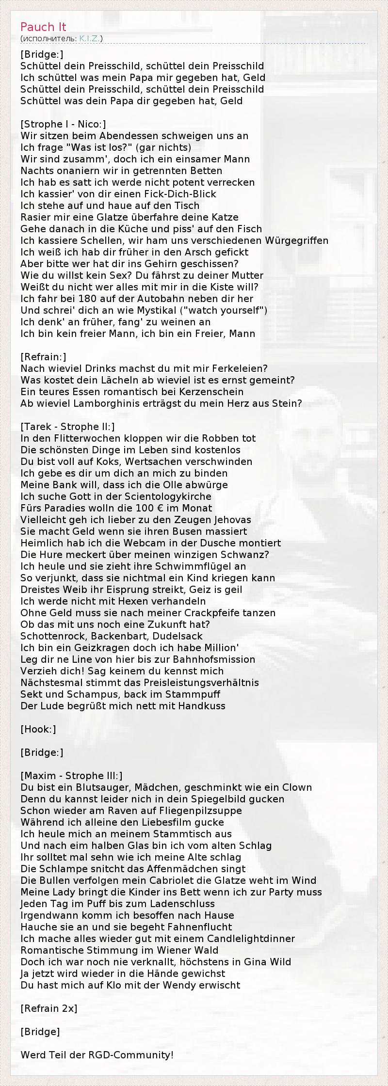 Это интересно:K.I.Z. это немецкая хип-хоп команда из Берлина. K.I.Z., по их собственному мнению, создали новый стиль немецкой рэп музыки, называя его "смесью панка и техно". Это прежде всего рэп батлы, как правило, заполненые большим количеством иронии и черного юмора. Группа состоит из четырех человек: Тарек, Максим, Нико (так известный как € 8000) и DJ Craft.Имеется несколько версий рассшифровки аббревиатуры... продолжение