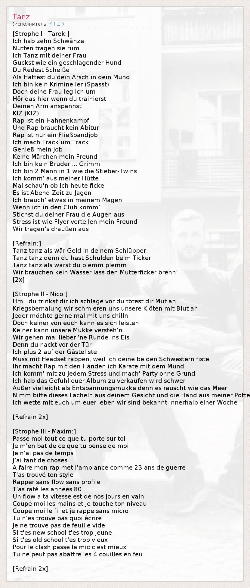 Это интересно:K.I.Z. это немецкая хип-хоп команда из Берлина. K.I.Z., по их собственному мнению, создали новый стиль немецкой рэп музыки, называя его "смесью панка и техно". Это прежде всего рэп батлы, как правило, заполненые большим количеством иронии и черного юмора. Группа состоит из четырех человек: Тарек, Максим, Нико (так известный как € 8000) и DJ Craft.Имеется несколько версий рассшифровки аббревиатуры... продолжение