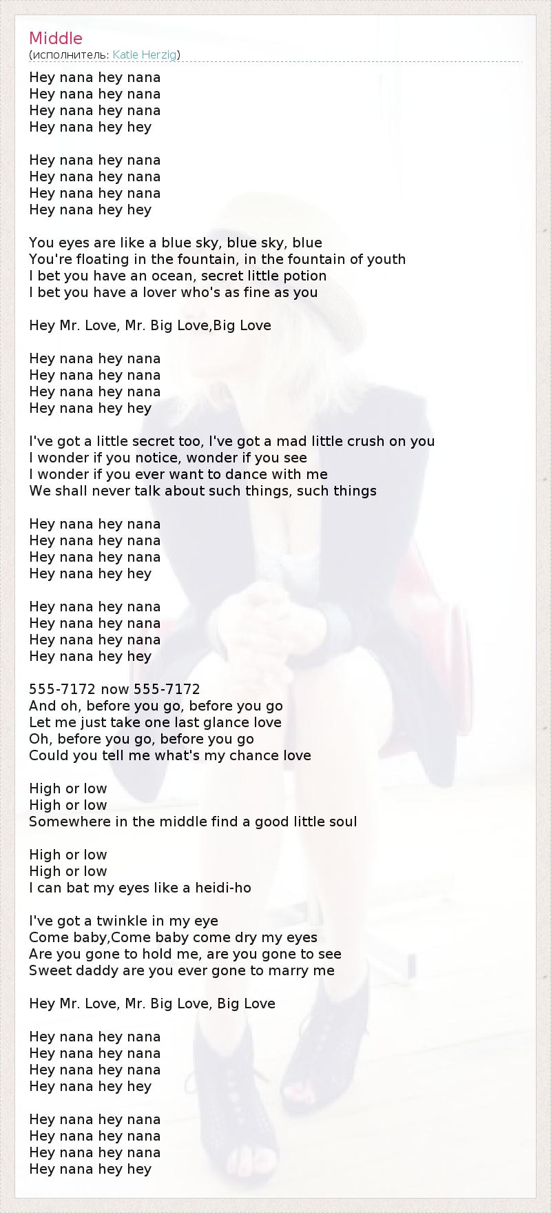 Hey nana hey nana Hey nana hey nana Hey nana hey nana Hey nana hey hey Hey nana hey nana Hey nana hey nana Hey nana hey nana Hey nana hey hey You eyes are like a blue sky, blue sky, blue You're floating in the fountain, in the fountain of youth I bet you have an ocean, secret little potion I bet you have a lover who's as fine as you Hey Mr. Love, Mr. Big Love,Big Love Hey nana hey nana Hey nana hey nana Hey nana hey nana Hey nana hey hey I've got a little secret too, I've got a mad little crush on you I wonder if you notice, wonder if you see I wonder if you ever want to dance with me We shall never talk about such things, such things Hey nana hey nana Hey nana hey nana Hey nana hey nana Hey nana hey hey Hey nana hey nana Hey nana hey nana Hey nana hey nana Hey nana hey hey 555-7172 now 555-7172 And oh, before you go, before you go Let me just take one last glance love Oh, before you go, before you go Could you tell me what's my chance love High or low High or low Somewhere in the middle find a good little soul High or low High or low I can bat my eyes like a heidi-ho I've got a twinkle in my eye Come baby,Come baby come dry my eyes Are you gone to hold me, are you gone to see Sweet daddy are you ever gone to marry me Hey Mr. Love, Mr. Big Love, Big Love Hey nana hey nana Hey nana hey nana Hey nana hey nana Hey nana hey hey Hey nana hey nana Hey nana hey nana Hey nana hey nana Hey nana hey hey