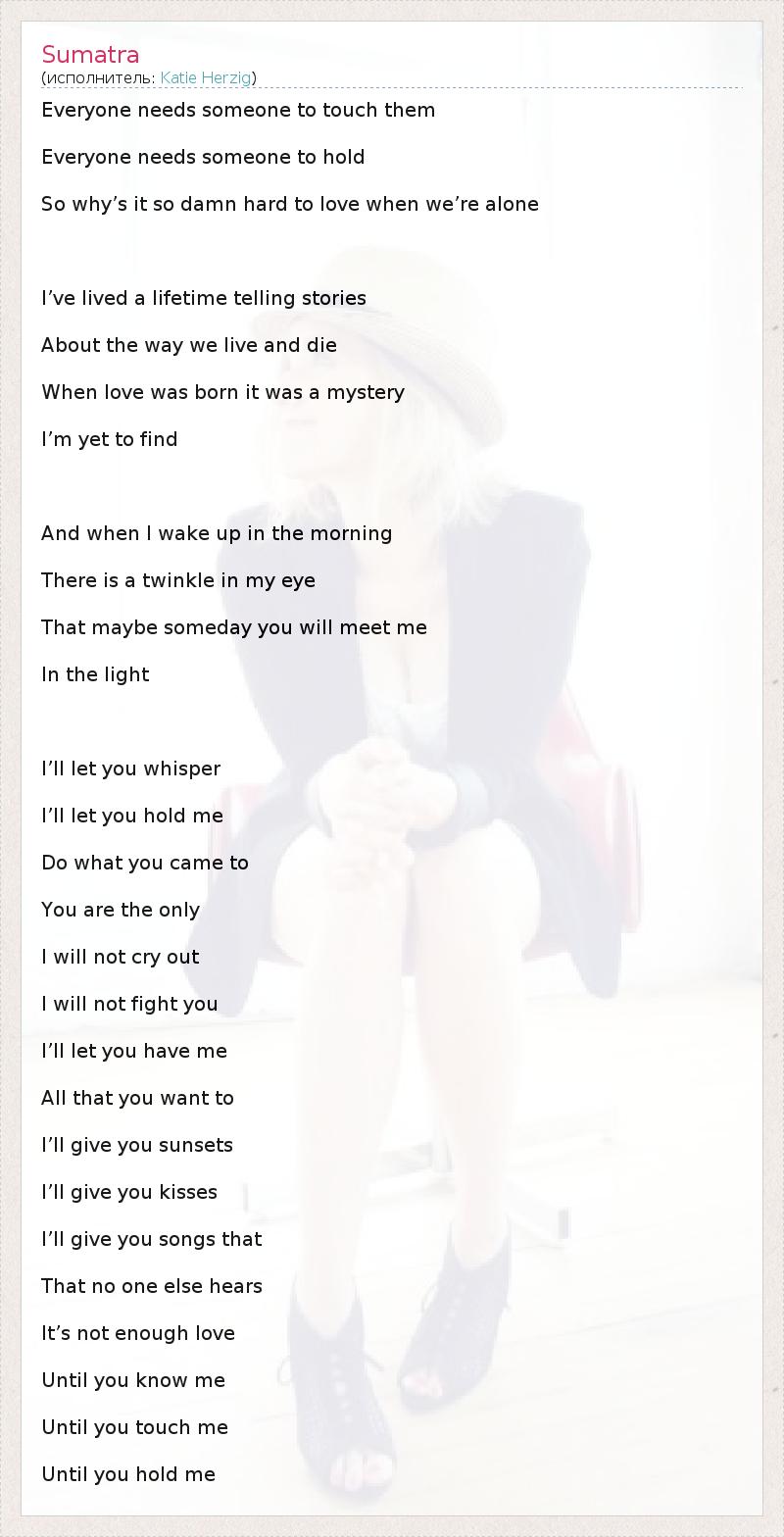 Everyone needs someone to touch them Everyone needs someone to hold So why’s it so damn hard to love when we’re alone I’ve lived a lifetime telling stories About the way we live and die When love was born it was a mystery I’m yet to find And when I wake up in the morning There is a twinkle in my eye That maybe someday you will meet me In the light I’ll let you whisper I’ll let you hold me Do what you came to You are the only I will not cry out I will not fight you I’ll let you have me All that you want to I’ll give you sunsets I’ll give you kisses I’ll give you songs that That no one else hears It’s not enough love Until you know me Until you touch me Until you hold me