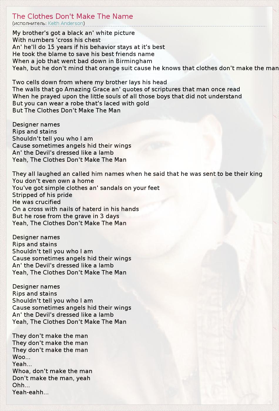 My brother's got a black an' white picture With numbers 'cross his chest An' he'll do 15 years if his behavior stays at it's best He took the blame to save his best friends name When a job that went bad down in Birmingham Yeah, but he don't mind that orange suit cause he knows that clothes don't make the man Two cells down from where my brother lays his head The walls that go Amazing Grace an' quotes of scriptures that man once read When he prayed upon the little souls of all those boys that did not understand But you can wear a robe that's laced with gold But The Clothes Don't Make The Man Designer names Rips and stains Shouldn't tell you who I am Cause sometimes angels hid their wings An' the Devil's dressed like a lamb Yeah, The Clothes Don't Make The Man They all laughed an called him names when he said that he was sent to be their king You don't even own a home You've got simple clothes an' sandals on your feet Stripped of his pride He was crucified On a cross with nails of haterd in his hands But he rose from the grave in 3 days Yeah, The Clothes Don't Make The Man Designer names Rips and stains Shouldn't tell you who I am Cause sometimes angels hid their wings An' the Devil's dressed like a lamb Yeah, The Clothes Don't Make The Man Designer names Rips and stains Shouldn't tell you who I am Cause sometimes angels hid their wings An' the Devil's dressed like a lamb Yeah, The Clothes Don't Make The Man They don't make the man They don't make the man They don't make the man Woo... Yeah... Whoa, don't make the man Don't make the man, yeah Ohh... Yeah-eahh...