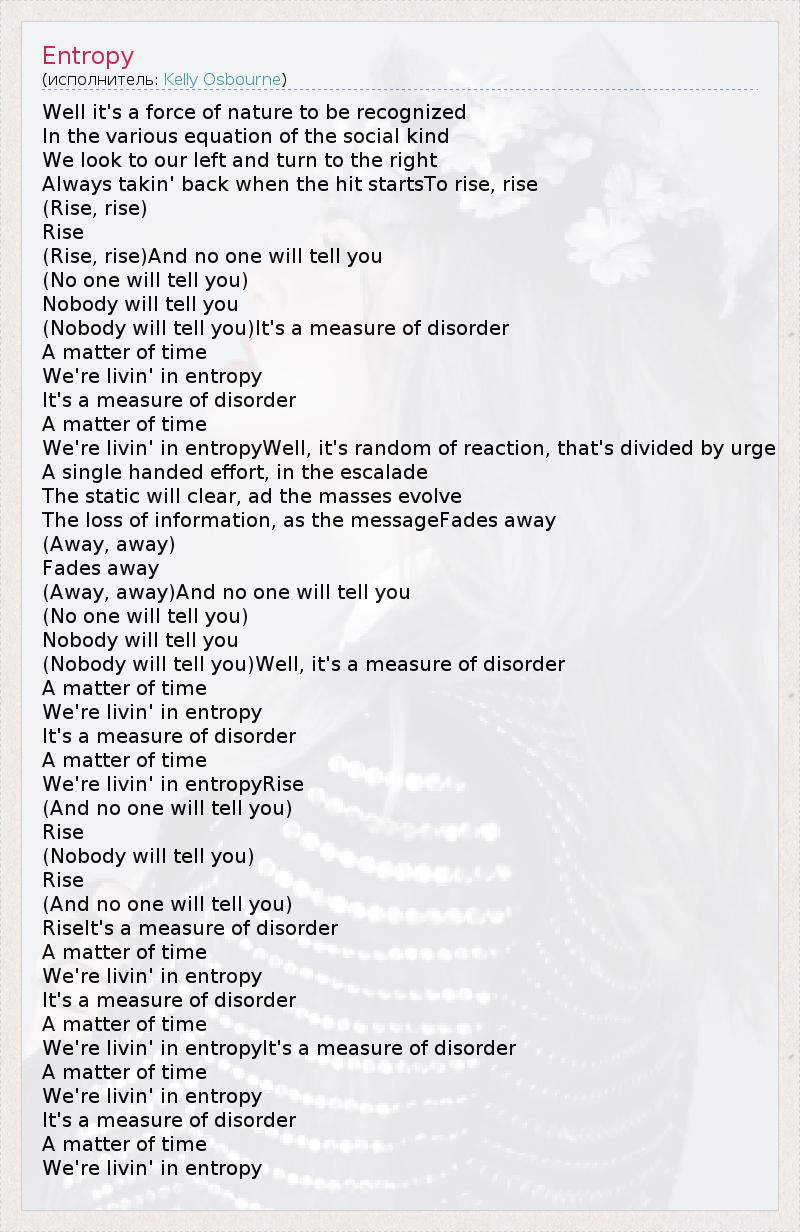 Well it's a force of nature to be recognized In the various equation of the social kind We look to our left and turn to the right Always takin' back when the hit startsTo rise, rise (Rise, rise) Rise (Rise, rise)And no one will tell you (No one will tell you) Nobody will tell you (Nobody will tell you)It's a measure of disorder A matter of time We're livin' in entropy It's a measure of disorder A matter of time We're livin' in entropyWell, it's random of reaction, that's divided by urge A single handed effort, in the escalade The static will clear, ad the masses evolve The loss of information, as the messageFades away (Away, away) Fades away (Away, away)And no one will tell you (No one will tell you) Nobody will tell you (Nobody will tell you)Well, it's a measure of disorder A matter of time We're livin' in entropy It's a measure of disorder A matter of time We're livin' in entropyRise (And no one will tell you) Rise (Nobody will tell you) Rise (And no one will tell you) RiseIt's a measure of disorder A matter of time We're livin' in entropy It's a measure of disorder A matter of time We're livin' in entropyIt's a measure of disorder A matter of time We're livin' in entropy It's a measure of disorder A matter of time We're livin' in entropy