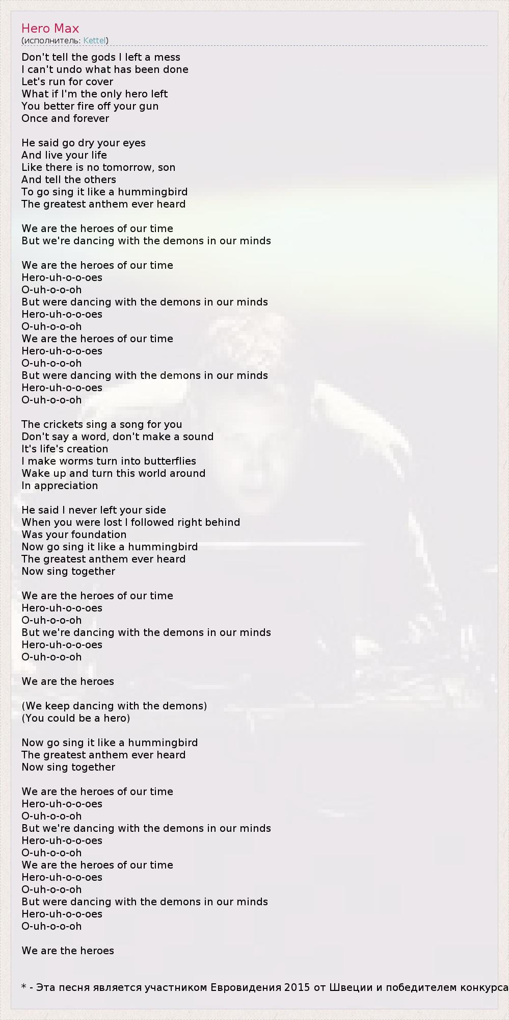 Don't tell the gods I left a mess I can't undo what has been done Let's run for cover What if I'm the only hero left You better fire off your gun Once and forever He said go dry your eyes And live your life Like there is no tomorrow, son And tell the others To go sing it like a hummingbird The greatest anthem ever heard We are the heroes of our time But we're dancing with the demons in our minds We are the heroes of our time Hero-uh-o-o-oes O-uh-o-o-oh But were dancing with the demons in our minds Hero-uh-o-o-oes O-uh-o-o-oh We are the heroes of our time Hero-uh-o-o-oes O-uh-o-o-oh But were dancing with the demons in our minds Hero-uh-o-o-oes O-uh-o-o-oh The crickets sing a song for you Don't say a word, don't make a sound It's life's creation I make worms turn into butterflies Wake up and turn this world around In appreciation He said I never left your side When you were lost I followed right behind Was your foundation Now go sing it like a hummingbird The greatest anthem ever heard Now sing together We are the heroes of our time Hero-uh-o-o-oes O-uh-o-o-oh But we're dancing with the demons in our minds Hero-uh-o-o-oes O-uh-o-o-oh We are the heroes (We keep dancing with the demons) (You could be a hero) Now go sing it like a hummingbird The greatest anthem ever heard Now sing together We are the heroes of our time Hero-uh-o-o-oes O-uh-o-o-oh But we're dancing with the demons in our minds Hero-uh-o-o-oes O-uh-o-o-oh We are the heroes of our time Hero-uh-o-o-oes O-uh-o-o-oh But were dancing with the demons in our minds Hero-uh-o-o-oes O-uh-o-o-oh We are the heroes * - Эта песня является участником Евровидения 2015 от Швеции и победителем конкурса