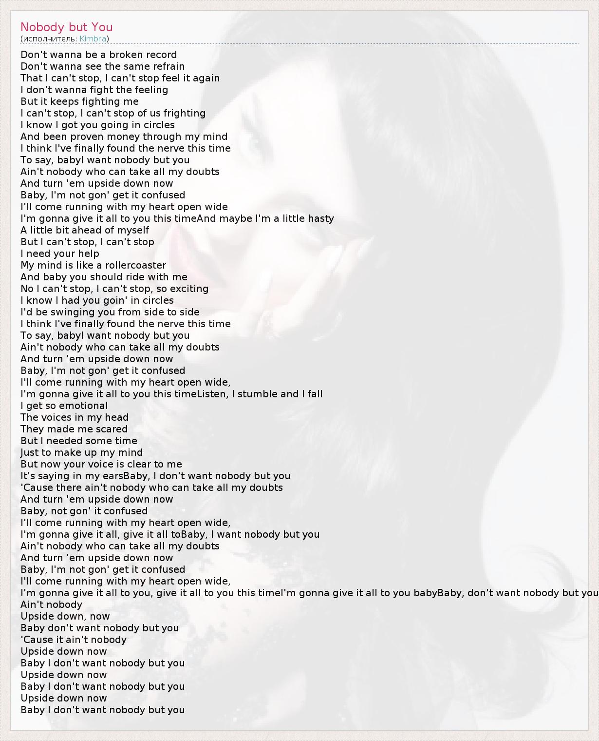 Don't wanna be a broken record Don't wanna see the same refrain That I can't stop, I can't stop feel it again I don't wanna fight the feeling But it keeps fighting me I can't stop, I can't stop of us frighting I know I got you going in circles And been proven money through my mind I think I've finally found the nerve this time To say, babyI want nobody but you Ain't nobody who can take all my doubts And turn 'em upside down now Baby, I'm not gon' get it confused I'll come running with my heart open wide I'm gonna give it all to you this timeAnd maybe I'm a little hasty A little bit ahead of myself But I can't stop, I can't stop I need your help My mind is like a rollercoaster And baby you should ride with me No I can't stop, I can't stop, so exciting I know I had you goin' in circles I'd be swinging you from side to side I think I've finally found the nerve this time To say, babyI want nobody but you Ain't nobody who can take all my doubts And turn 'em upside down now Baby, I'm not gon' get it confused I'll come running with my heart open wide, I'm gonna give it all to you this timeListen, I stumble and I fall I get so emotional The voices in my head They made me scared But I needed some time Just to make up my mind But now your voice is clear to me It's saying in my earsBaby, I don't want nobody but you 'Cause there ain't nobody who can take all my doubts And turn 'em upside down now Baby, not gon' it confused I'll come running with my heart open wide, I'm gonna give it all, give it all toBaby, I want nobody but you Ain't nobody who can take all my doubts And turn 'em upside down now Baby, I'm not gon' get it confused I'll come running with my heart open wide, I'm gonna give it all to you, give it all to you this timeI'm gonna give it all to you babyBaby, don't want nobody but you Ain't nobody Upside down, now Baby don't want nobody but you 'Cause it ain't nobody Upside down now Baby I don't want nobody but you Upside down now Baby I don't want nobody but you Upside down now Baby I don't want nobody but you