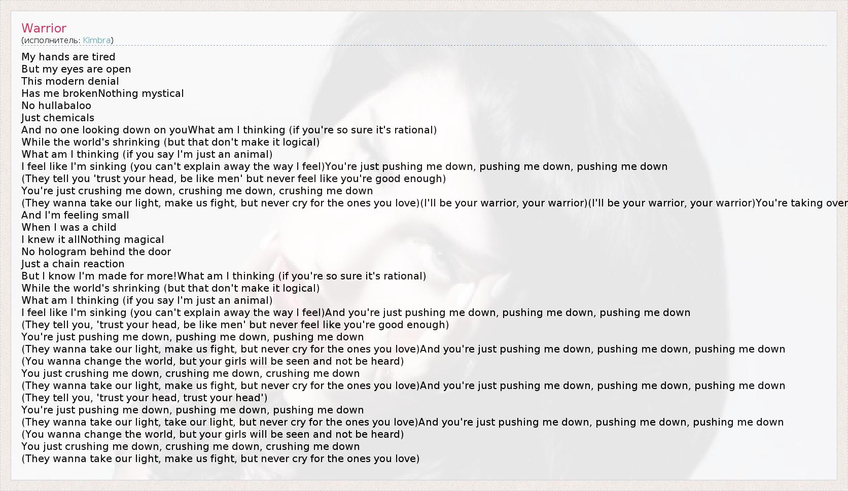 My hands are tired But my eyes are open This modern denial Has me brokenNothing mystical No hullabaloo Just chemicals And no one looking down on youWhat am I thinking (if you're so sure it's rational) While the world's shrinking (but that don't make it logical) What am I thinking (if you say I'm just an animal) I feel like I'm sinking (you can't explain away the way I feel)You're just pushing me down, pushing me down, pushing me down (They tell you 'trust your head, be like men' but never feel like you're good enough) You're just crushing me down, crushing me down, crushing me down (They wanna take our light, make us fight, but never cry for the ones you love)(I'll be your warrior, your warrior)(I'll be your warrior, your warrior)You're taking over And I'm feeling small When I was a child I knew it allNothing magical No hologram behind the door Just a chain reaction But I know I'm made for more!What am I thinking (if you're so sure it's rational) While the world's shrinking (but that don't make it logical) What am I thinking (if you say I'm just an animal) I feel like I'm sinking (you can't explain away the way I feel)And you're just pushing me down, pushing me down, pushing me down (They tell you, 'trust your head, be like men' but never feel like you're good enough) You're just pushing me down, pushing me down, pushing me down (They wanna take our light, make us fight, but never cry for the ones you love)And you're just pushing me down, pushing me down, pushing me down (You wanna change the world, but your girls will be seen and not be heard) You just crushing me down, crushing me down, crushing me down (They wanna take our light, make us fight, but never cry for the ones you love)And you're just pushing me down, pushing me down, pushing me down (They tell you, 'trust your head, trust your head') You're just pushing me down, pushing me down, pushing me down (They wanna take our light, take our light, but never cry for the ones you love)And you're just pushing me down, pushing me down, pushing me down (You wanna change the world, but your girls will be seen and not be heard) You just crushing me down, crushing me down, crushing me down (They wanna take our light, make us fight, but never cry for the ones you love)