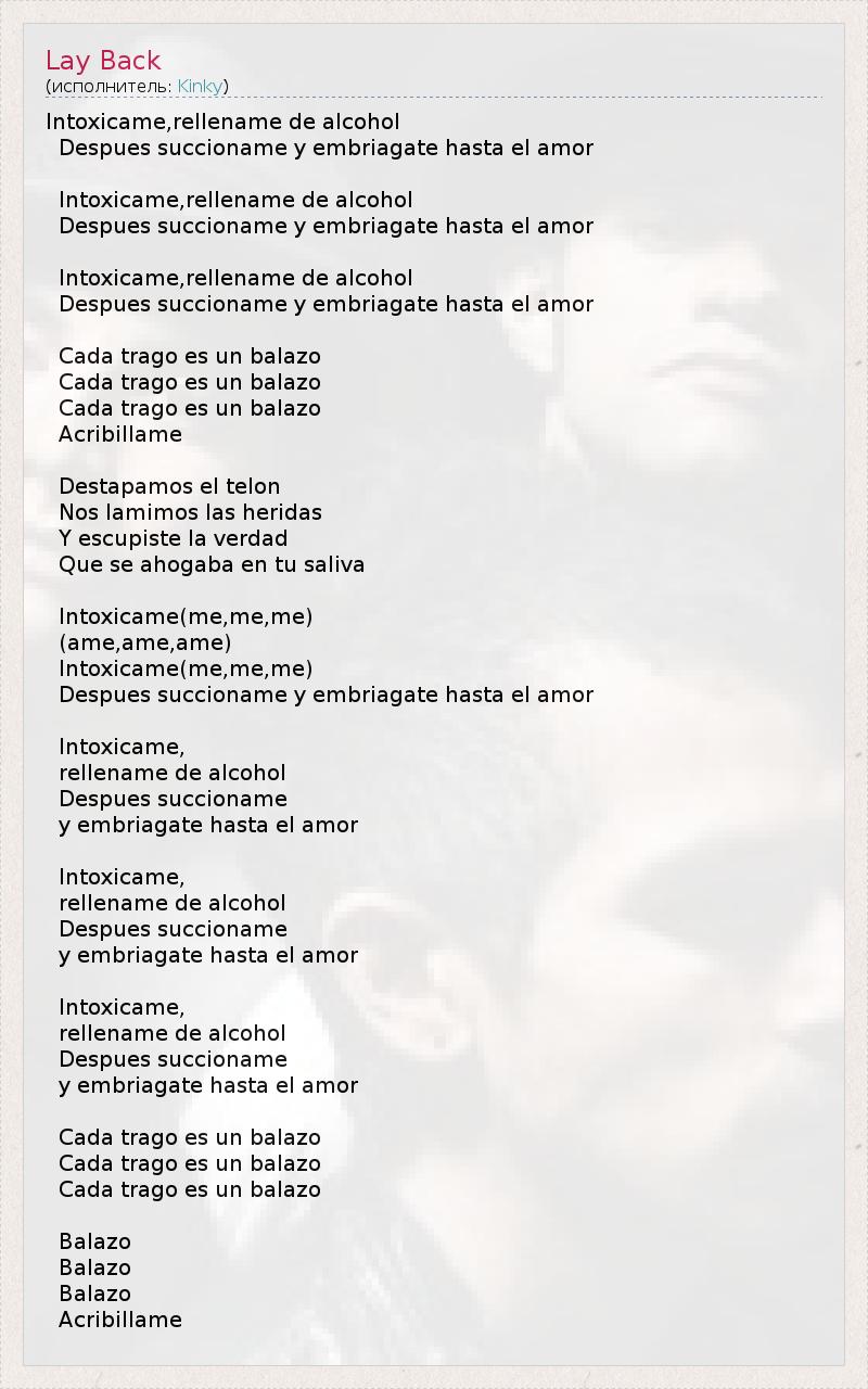Intoxicame,rellename de alcohol Despues succioname y embriagate hasta el amor Intoxicame,rellename de alcohol Despues succioname y embriagate hasta el amor Intoxicame,rellename de alcohol Despues succioname y embriagate hasta el amor Cada trago es un balazo Cada trago es un balazo Cada trago es un balazo Acribillame Destapamos el telon Nos lamimos las heridas Y escupiste la verdad Que se ahogaba en tu saliva Intoxicame(me,me,me) (ame,ame,ame) Intoxicame(me,me,me) Despues succioname y embriagate hasta el amor Intoxicame, rellename de alcohol Despues succioname y embriagate hasta el amor Intoxicame, rellename de alcohol Despues succioname y embriagate hasta el amor Intoxicame, rellename de alcohol Despues succioname y embriagate hasta el amor Cada trago es un balazo Cada trago es un balazo Cada trago es un balazo Balazo Balazo Balazo Acribillame