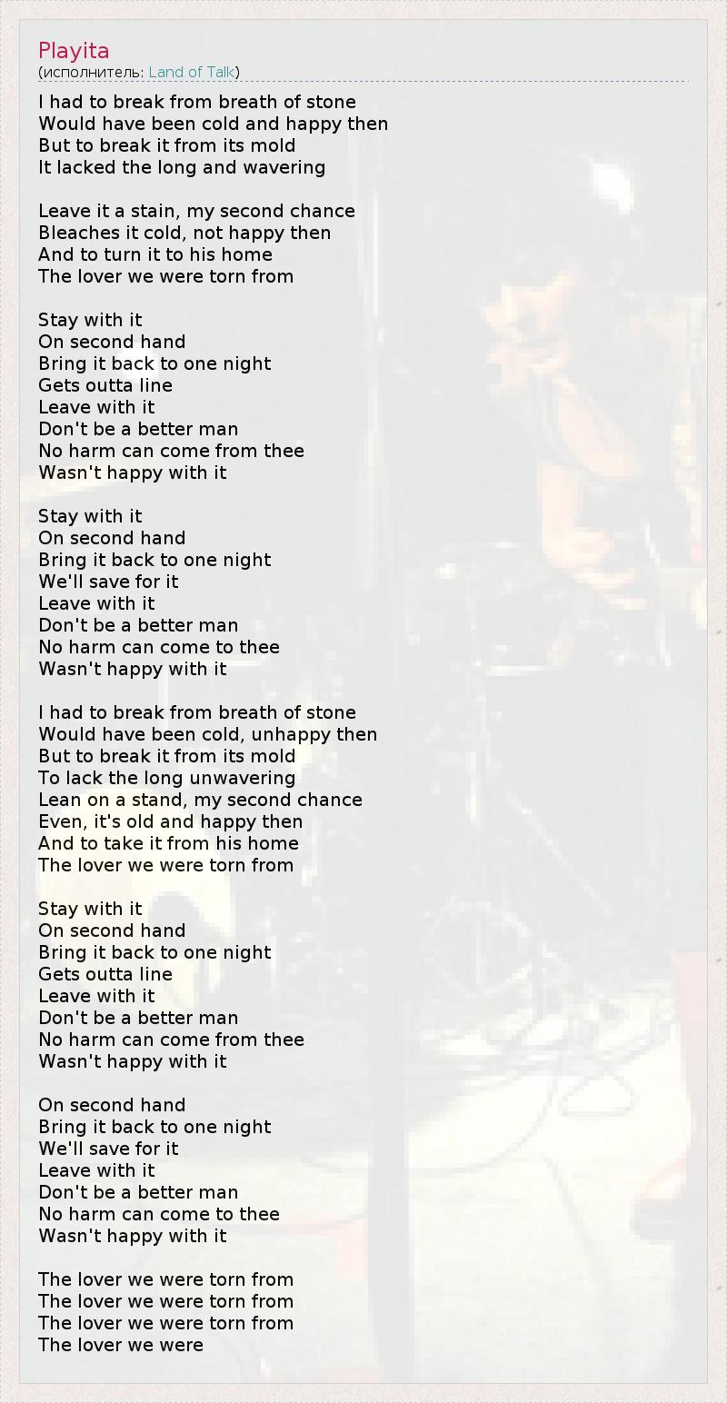 I had to break from breath of stone Would have been cold and happy then But to break it from its mold It lacked the long and wavering Leave it a stain, my second chance Bleaches it cold, not happy then And to turn it to his home The lover we were torn from Stay with it On second hand Bring it back to one night Gets outta line Leave with it Don't be a better man No harm can come from thee Wasn't happy with it Stay with it On second hand Bring it back to one night We'll save for it Leave with it Don't be a better man No harm can come to thee Wasn't happy with it I had to break from breath of stone Would have been cold, unhappy then But to break it from its mold To lack the long unwavering Lean on a stand, my second chance Even, it's old and happy then And to take it from his home The lover we were torn from Stay with it On second hand Bring it back to one night Gets outta line Leave with it Don't be a better man No harm can come from thee Wasn't happy with it On second hand Bring it back to one night We'll save for it Leave with it Don't be a better man No harm can come to thee Wasn't happy with it The lover we were torn from The lover we were torn from The lover we were torn from The lover we were