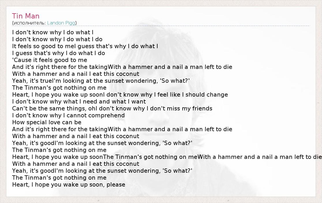 Heart, I hope you wake up soonThe Tinman's got nothing on meWith a hammer and a nail a man left to die
